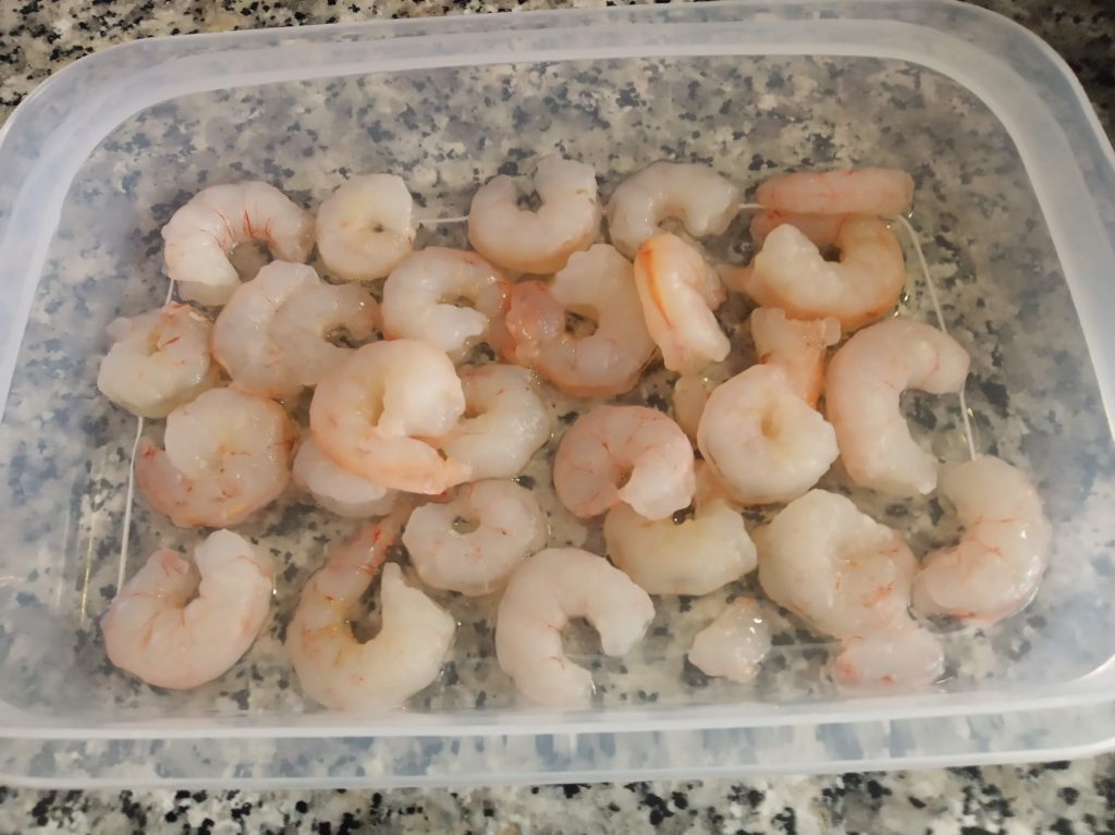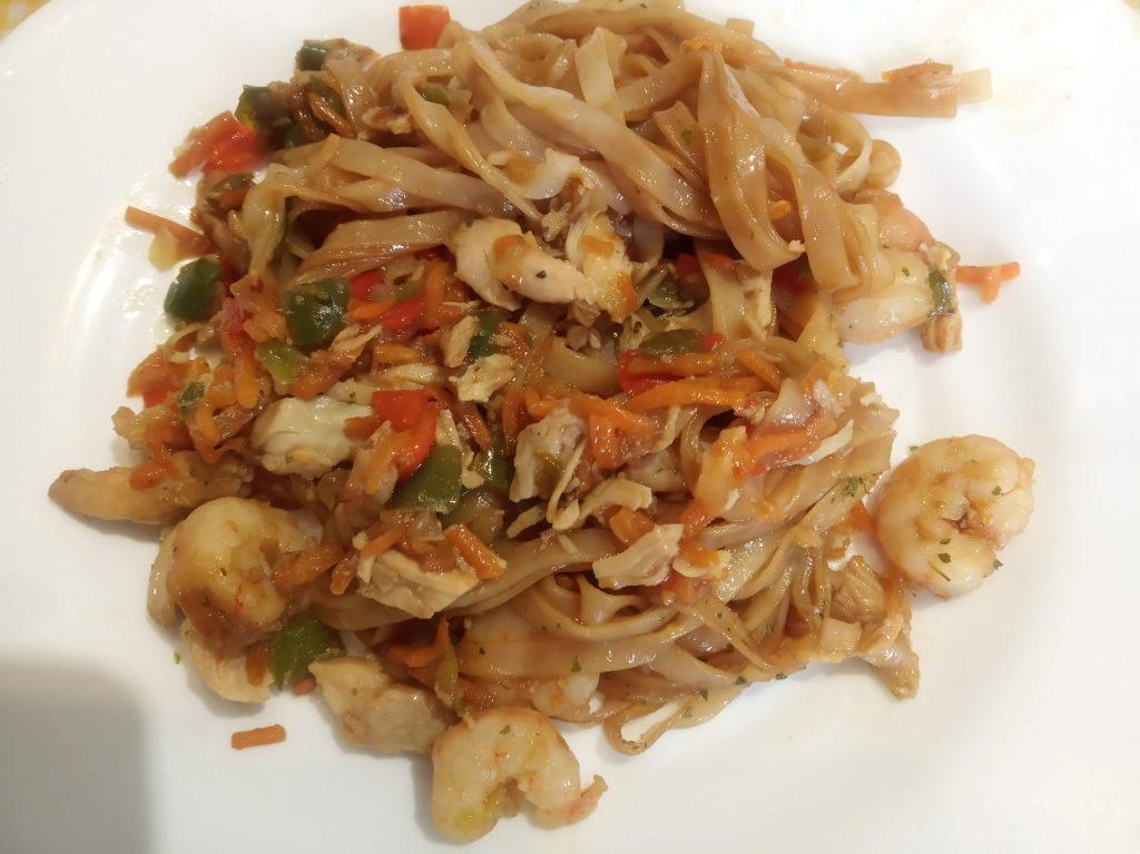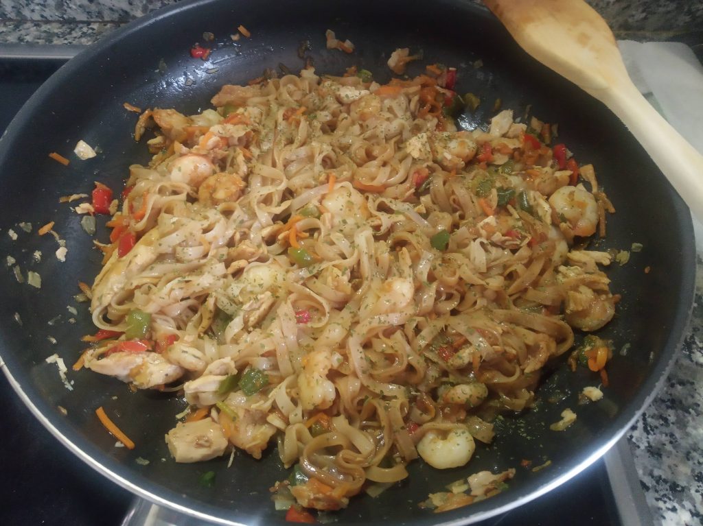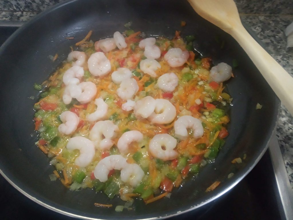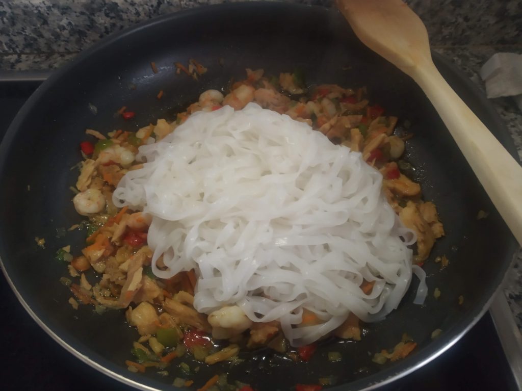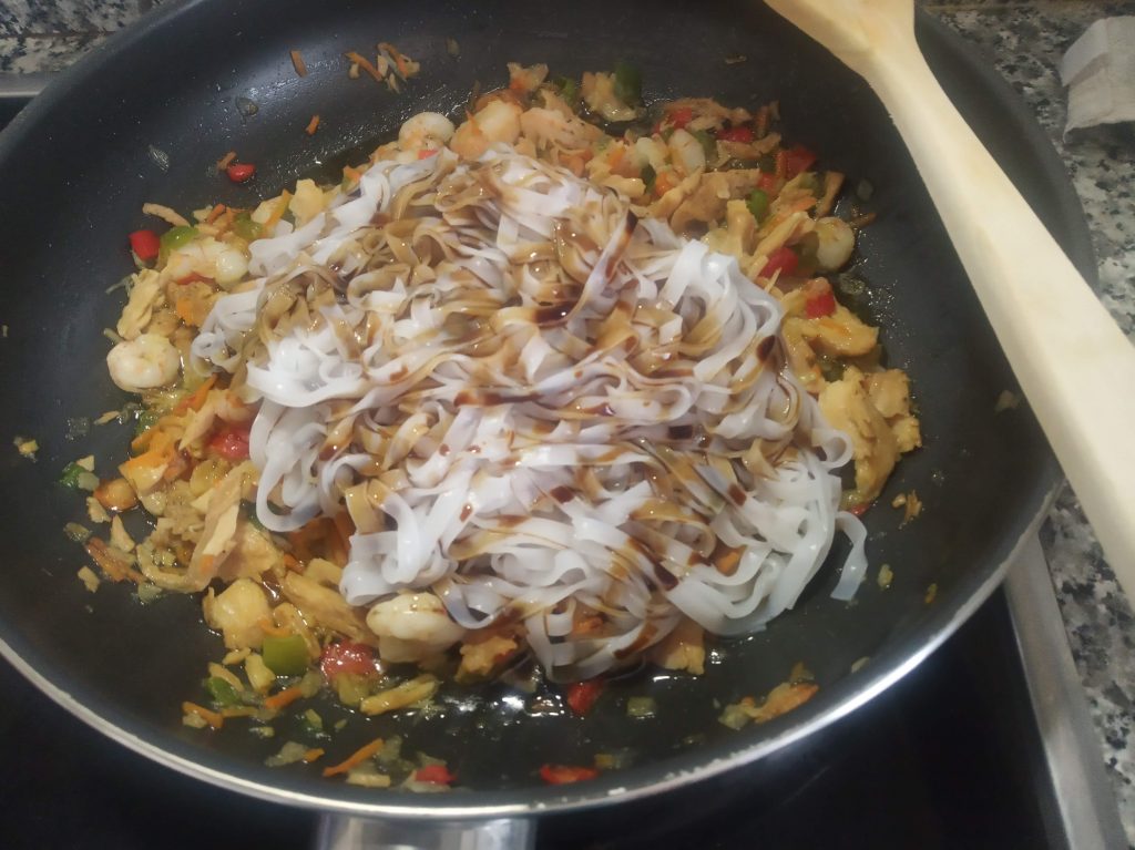 Añadir las colas de gambas y cuando cambien de color, añadir los fideos y la salsa de soja dulce.