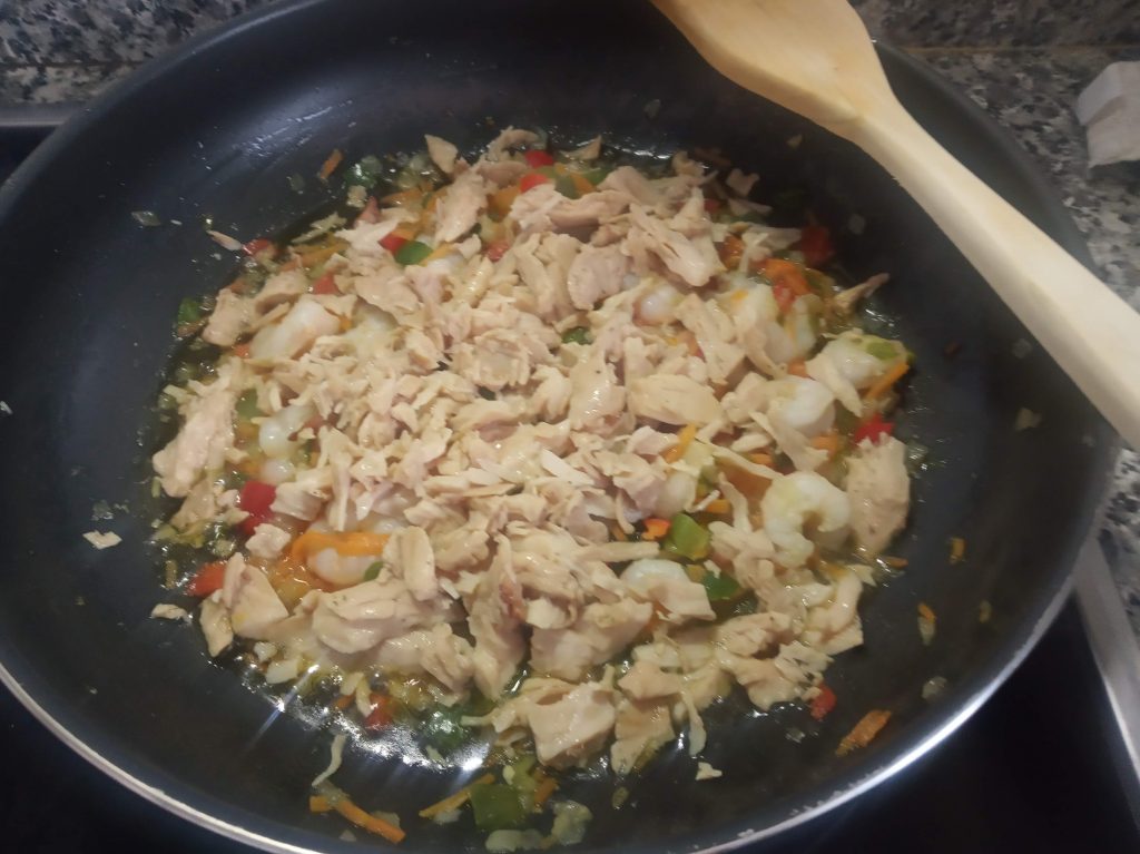 Luego añadimos el pollo troceado en tiras finas, y sofreír muy bien.