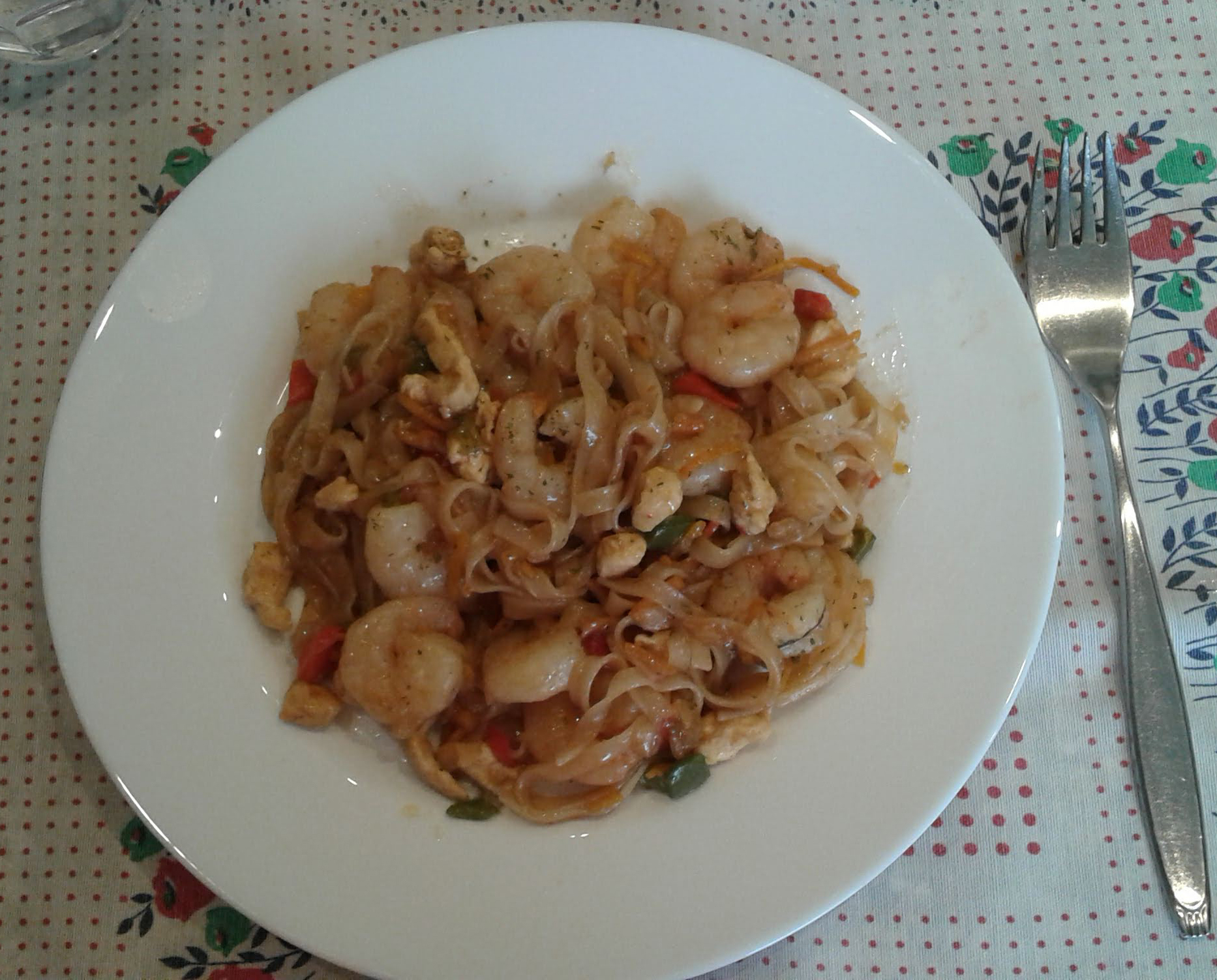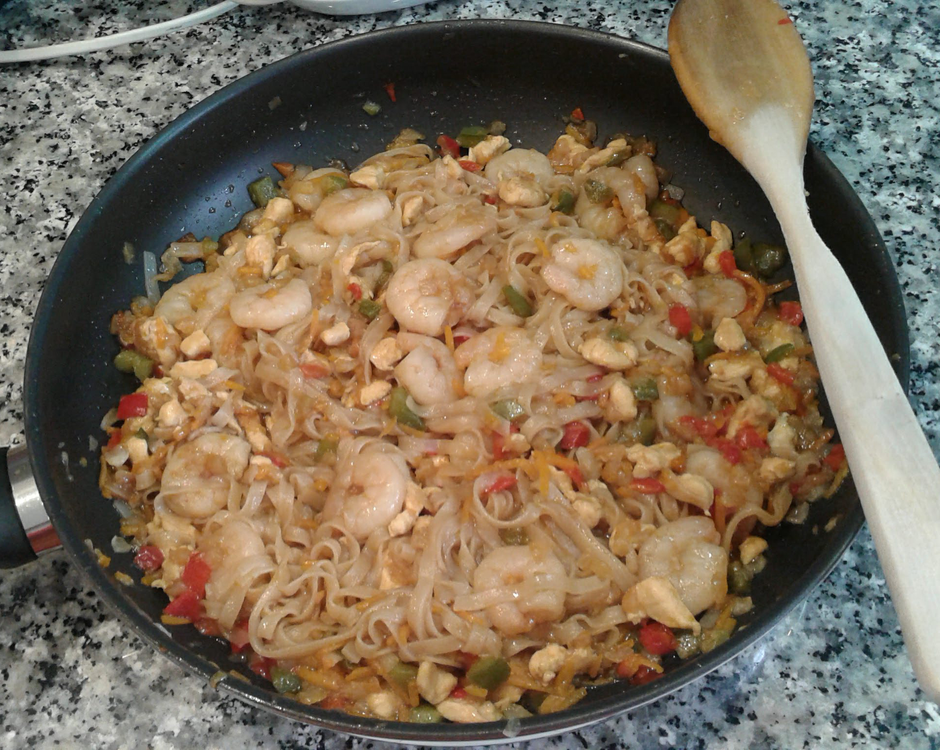 Añadir las colas de gambas y cuando cambien de color, añadir los fideos y la salsa de soja dulce.