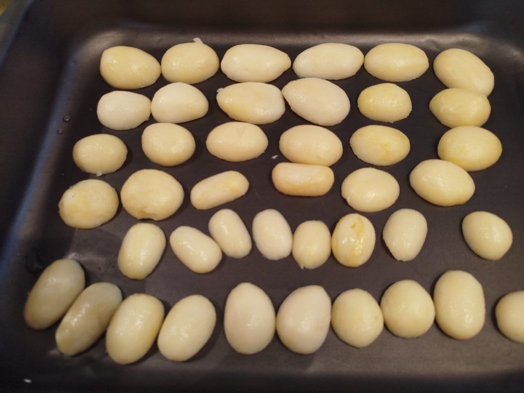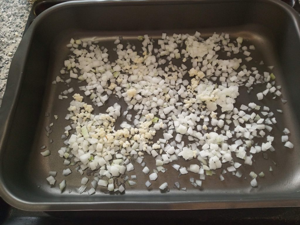 Poner en el fondo de la bandeja, la cebolla y ajo troceado, en mi caso congelados.