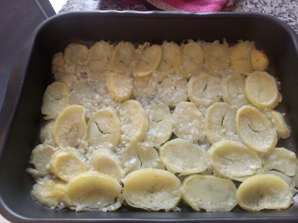 Pelar y cortar las patatas en rodajas de 1 o 2 cm, repartir en la fuente, echar un poco de sal y pimienta, un poco de aceite y 3 vasos de agua por los lados de la fuente, para que no se mueva, las patatas.