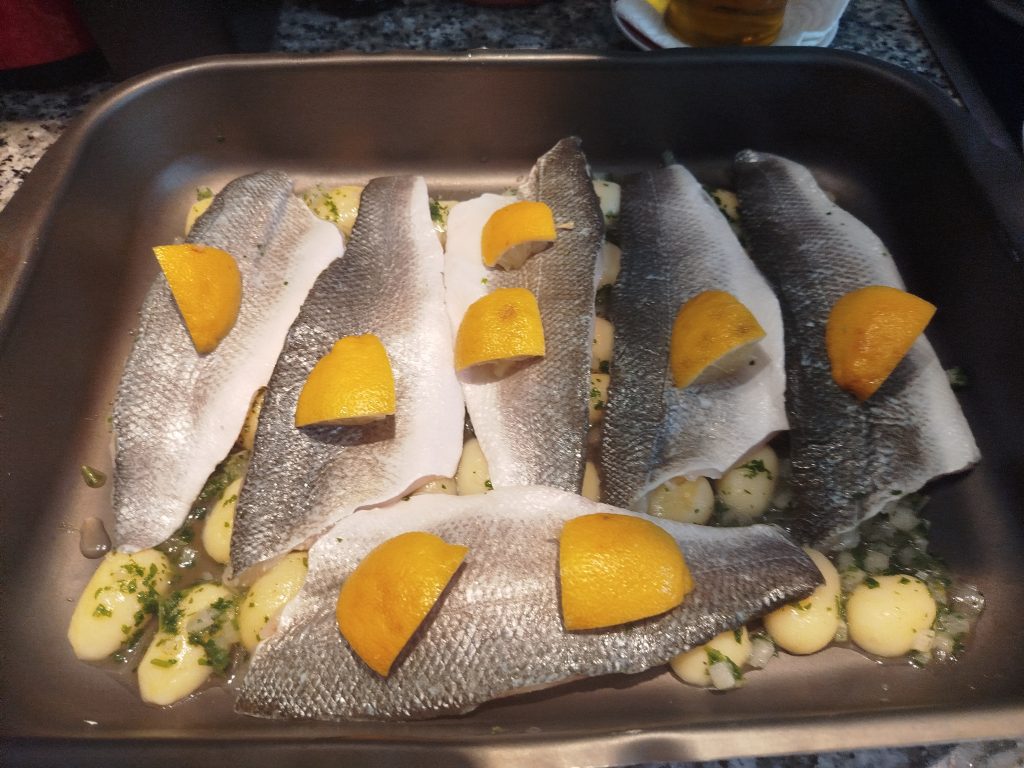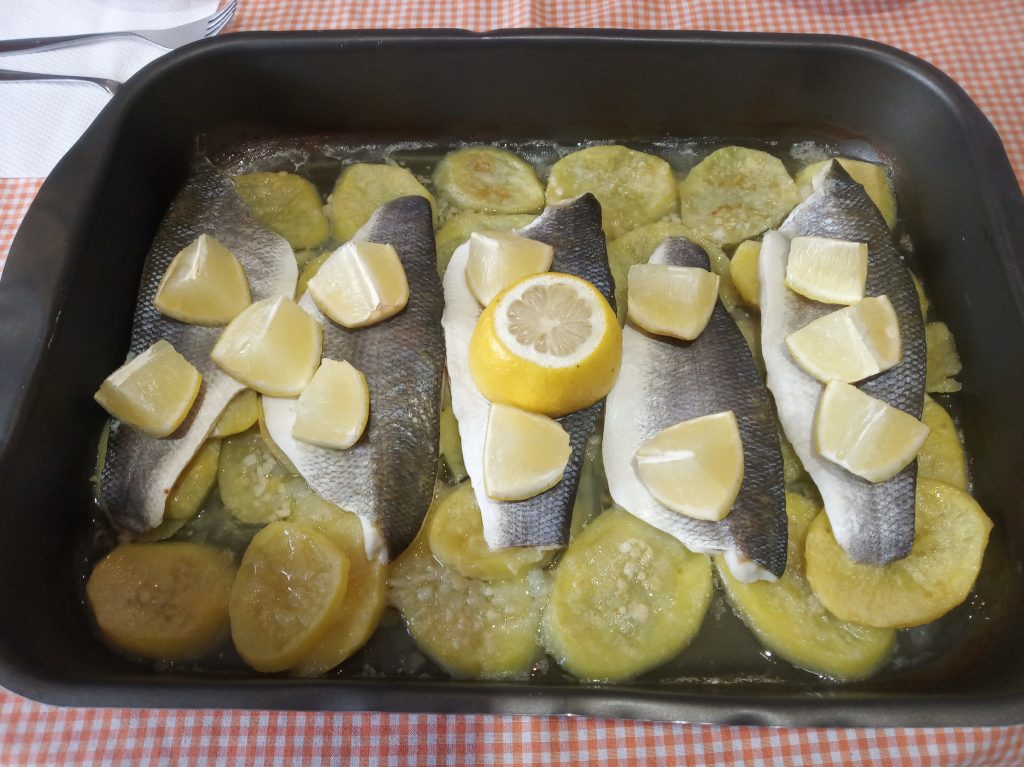 Salpimentar la lubina y meterla con la piel para arriba, echar medio Limón exprimido y el resto troceado en cuartos.