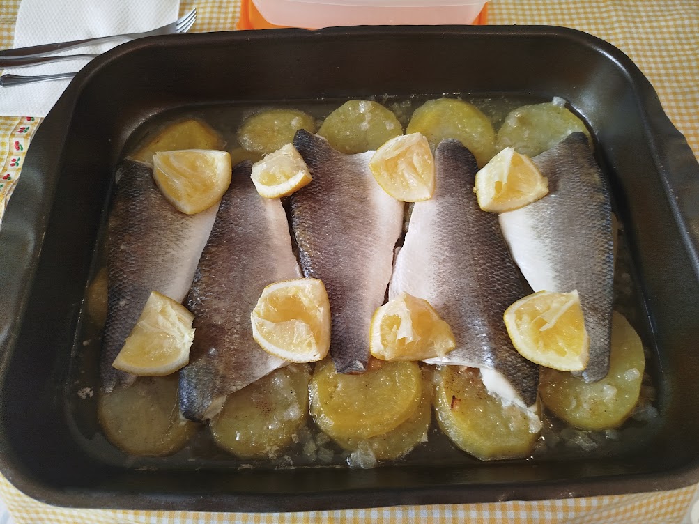 Meter la fuente en el horno unos 35 minutos, pinchar y ver que las patatas están tiernas, mirar de vez en cuando, cada horno es distinto.