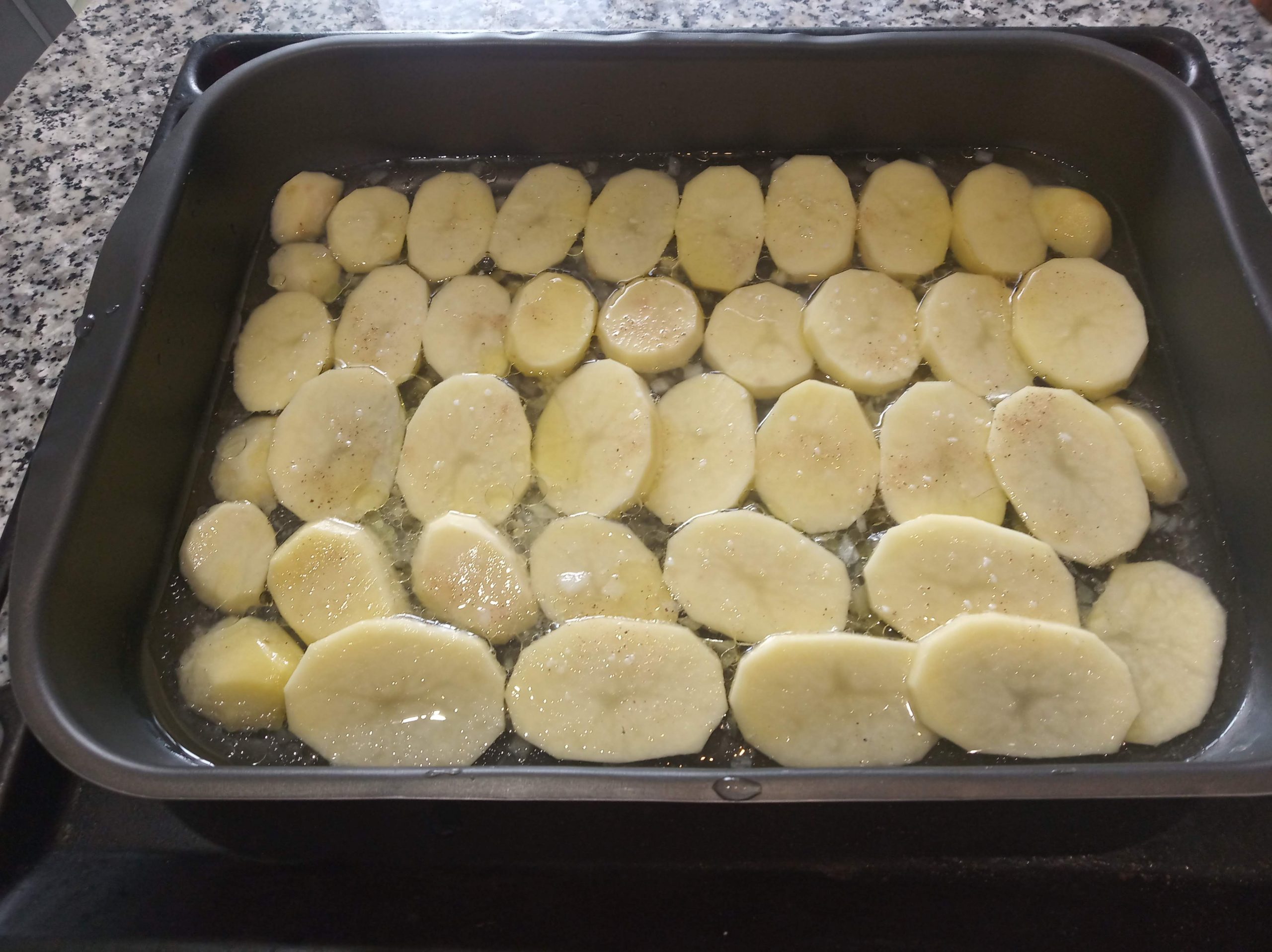 Pelar y cortar las patatas en rodajas de 1 o 2 cm, repartir en la fuente, echar un poco de sal y pimienta, un poco de aceite y 3 vasos de agua por los lados de la fuente, para que no se mueva, las patatas.