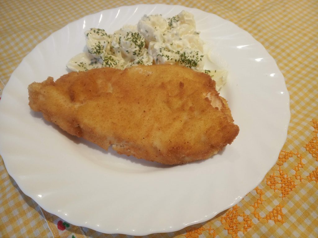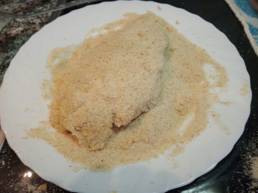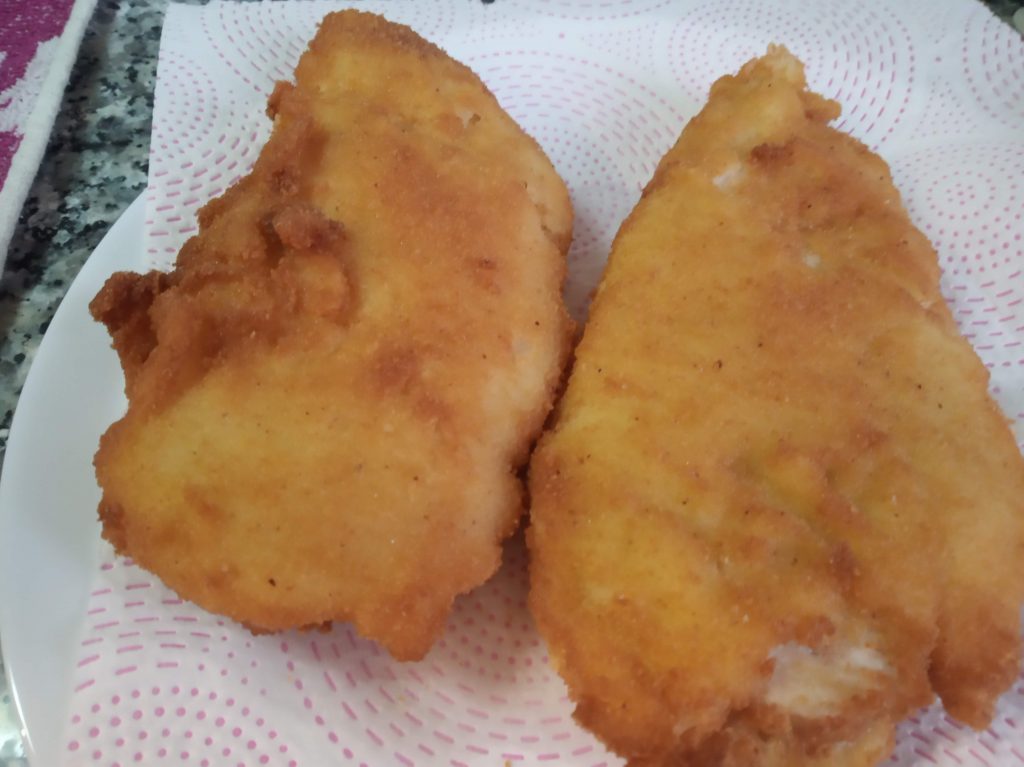 Servir los filetes empanados con el acompañamiento y perejil por encima.