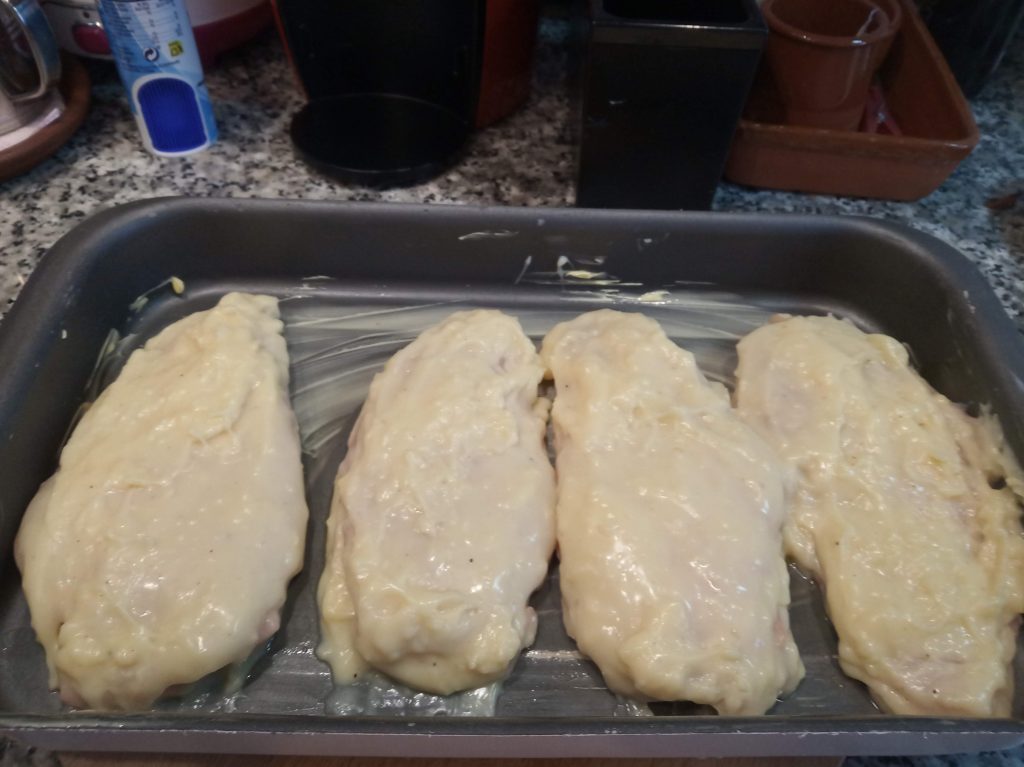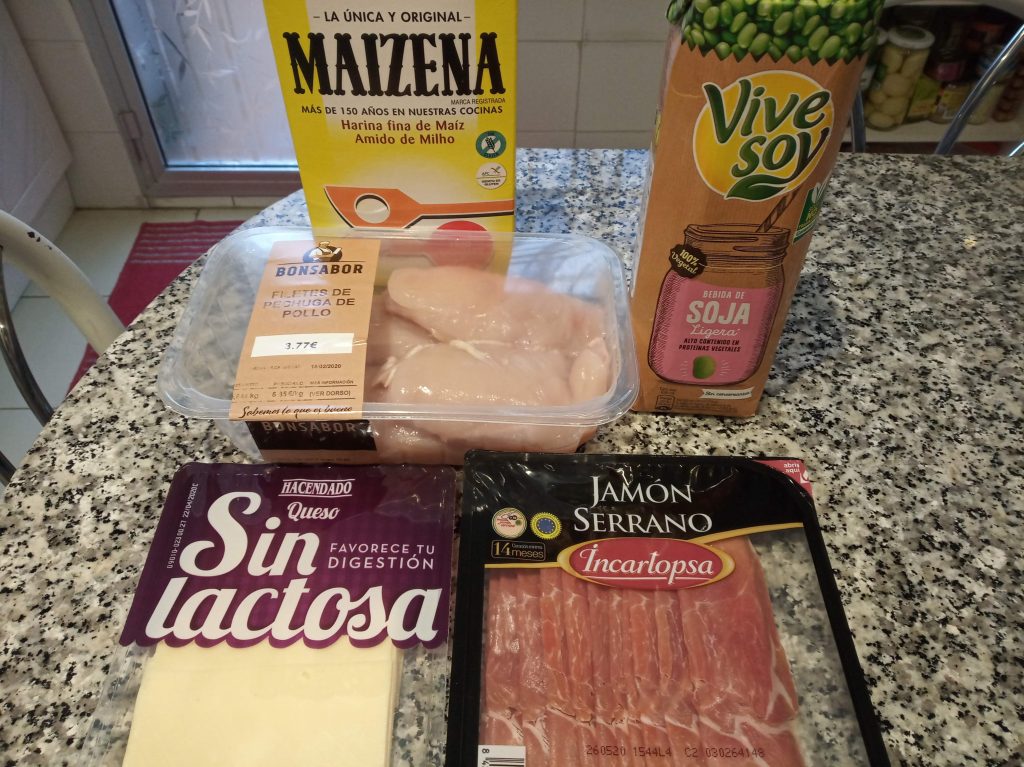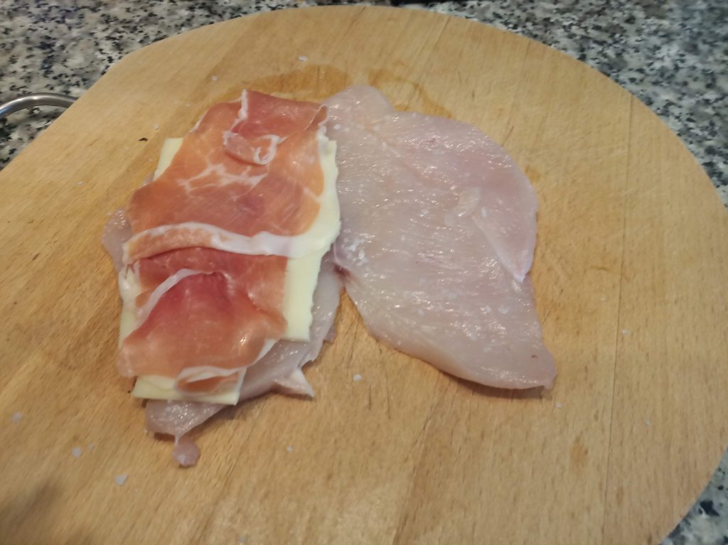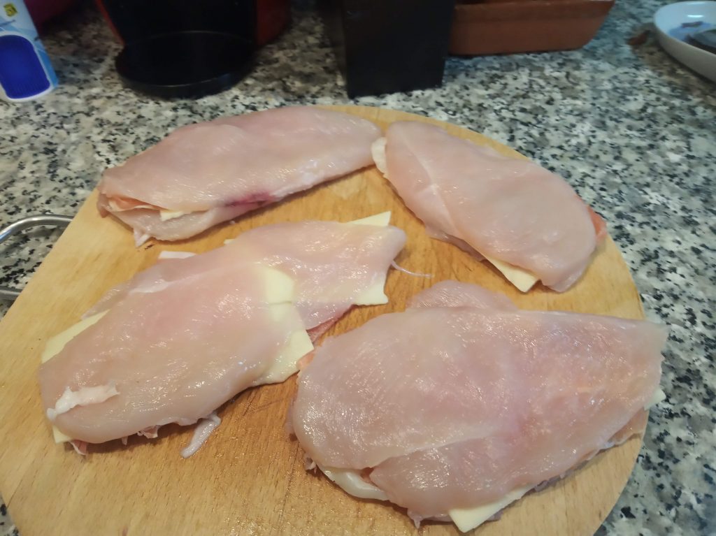 Salpimentar los filetes o libros de pollos, extender en la tabla. Cubrelos con una loncha de jamón y otra de queso, tapar con otro filete o cerrar el libro.