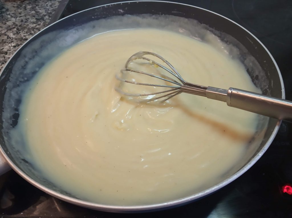 Meter en el frigorífico tapado con film transparente y dejar que se enfríe la bechamel para poder ser manipulada. Varias horas o el día anterior.