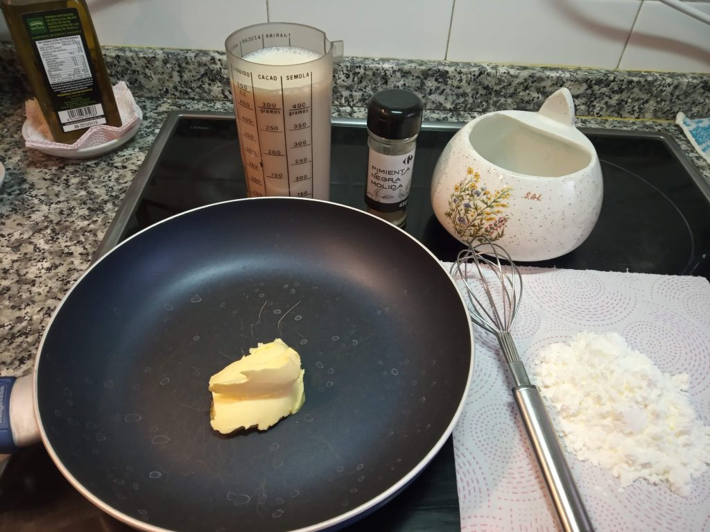 Bechamel: Funde 30 g de mantequilla e n una sartén, añade la harina y rehógala bien. Vierte la leche poco a poco sin dejar de remover con una varilla, salpimentar y cocinar durante unos 5 minutos, hasta que espese. Reservar.