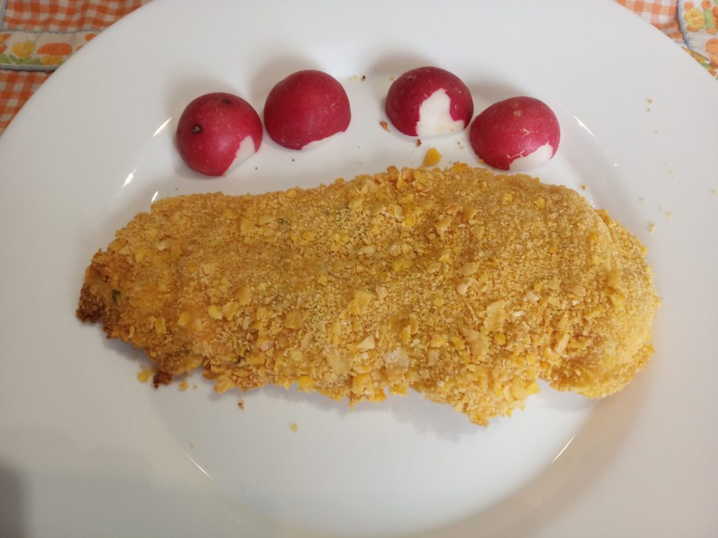 Pasar los filetes de pollos, por el huevo batido, dejar escurrir bien, y pasar por el pan crujiente, por los dos lados, aplastar que se pegue bien, ir colocando en la bandeja del horno, si hace falta cubrir bien con el pan crujiente por los dos lados, así todos los filetes.