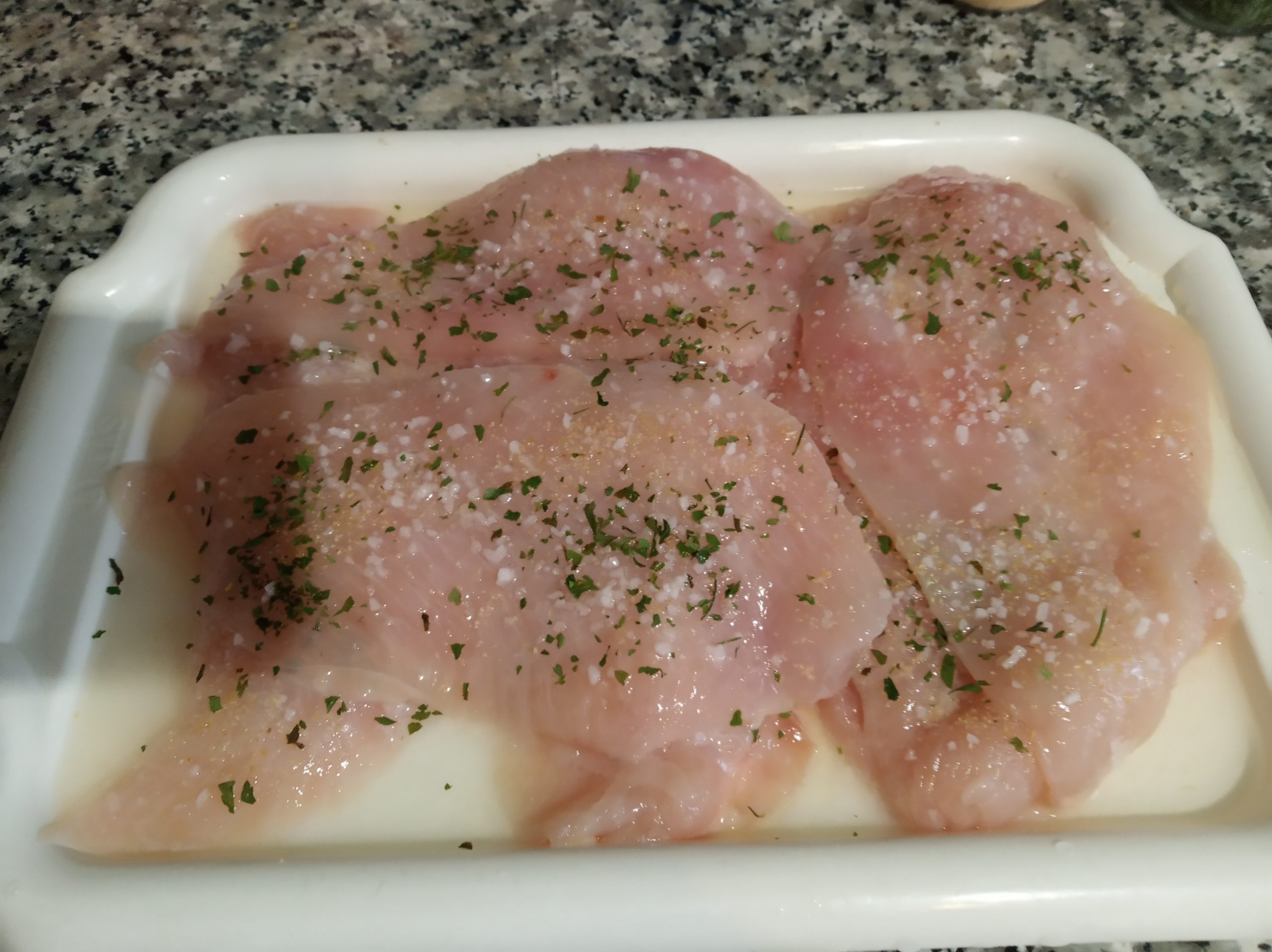 Con tiempo, macerar los filetes de pollos, con un poco de sal, ajo, perejil y zumo de limón, reservar tapado, hasta la hora de hacerlo.