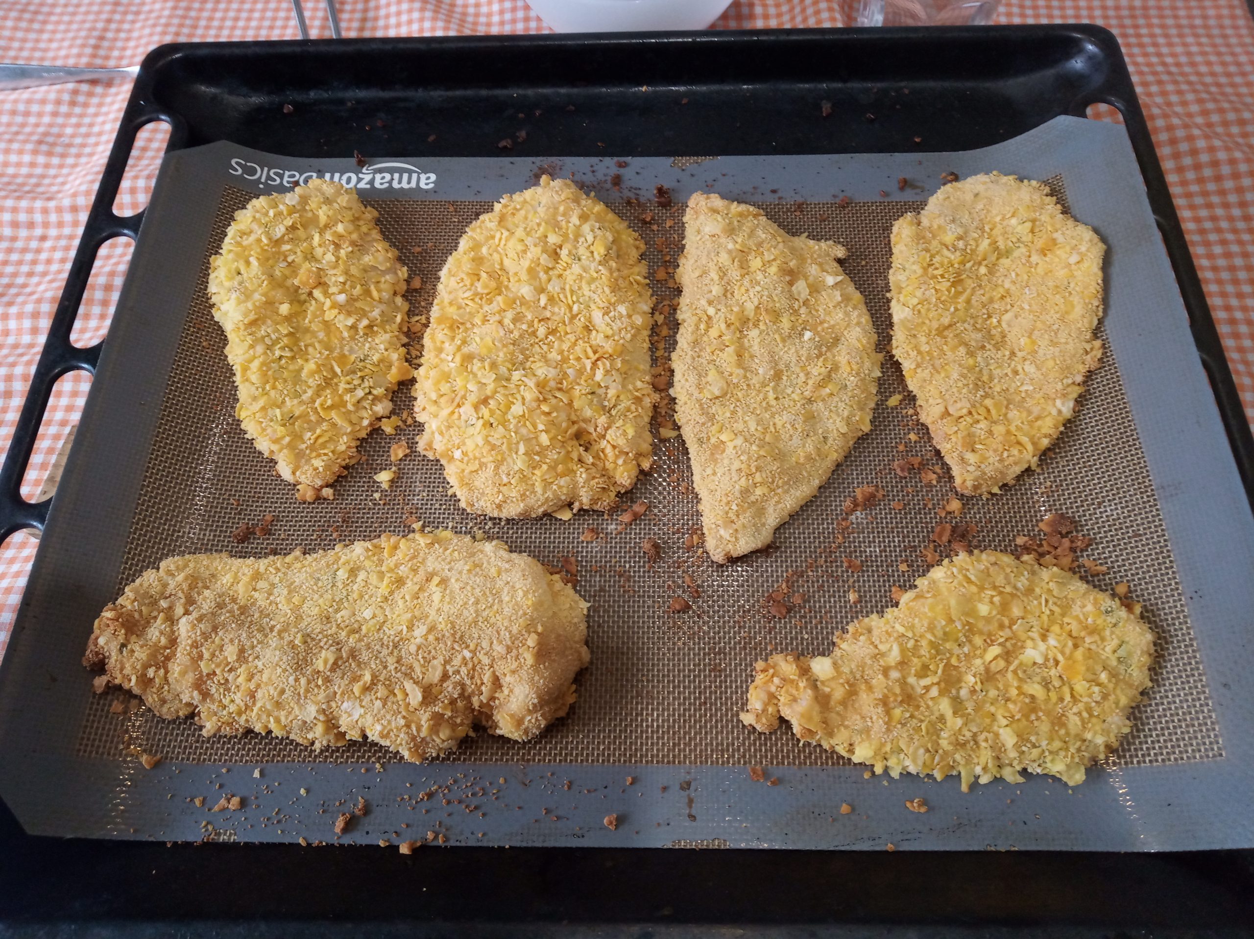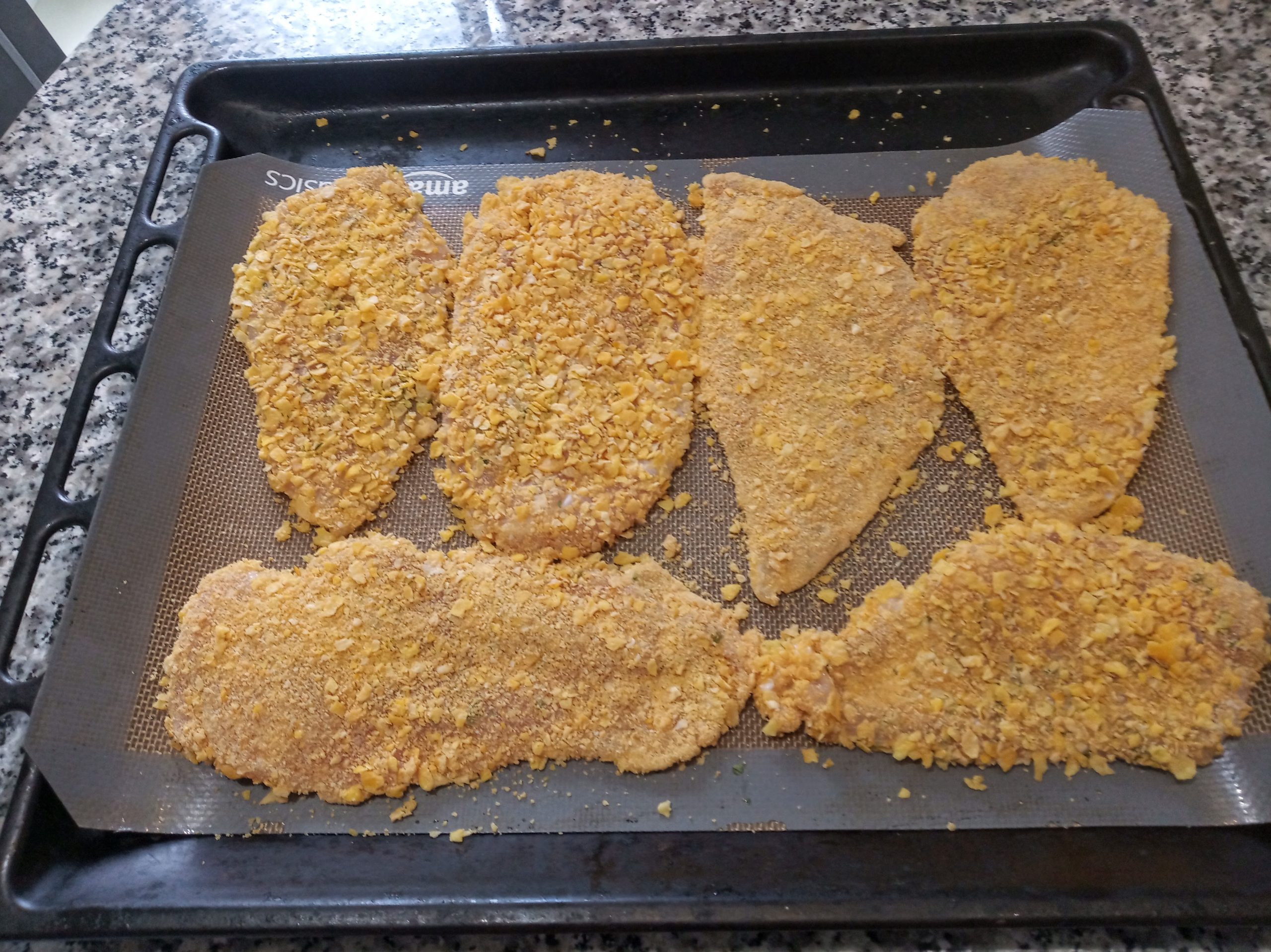 Pasar los filetes de pollos, por el huevo batido, dejar escurrir bien, y pasar por el pan crujiente, por los dos lados, aplastar que se pegue bien, ir colocando en la bandeja del horno, si hace falta cubrir bien con el pan crujiente por los dos lados, así todos los filetes.
