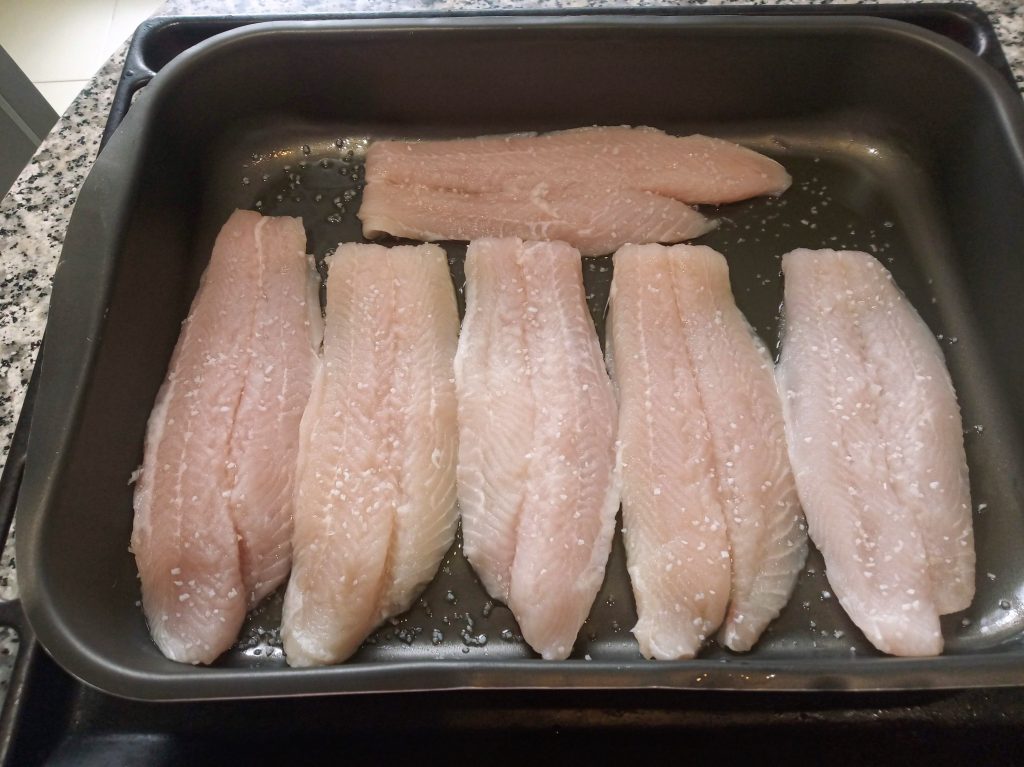 Lavar bien bajo el grifo, y echar un poco de sal por las dos caras a los filetes de Tilapia.