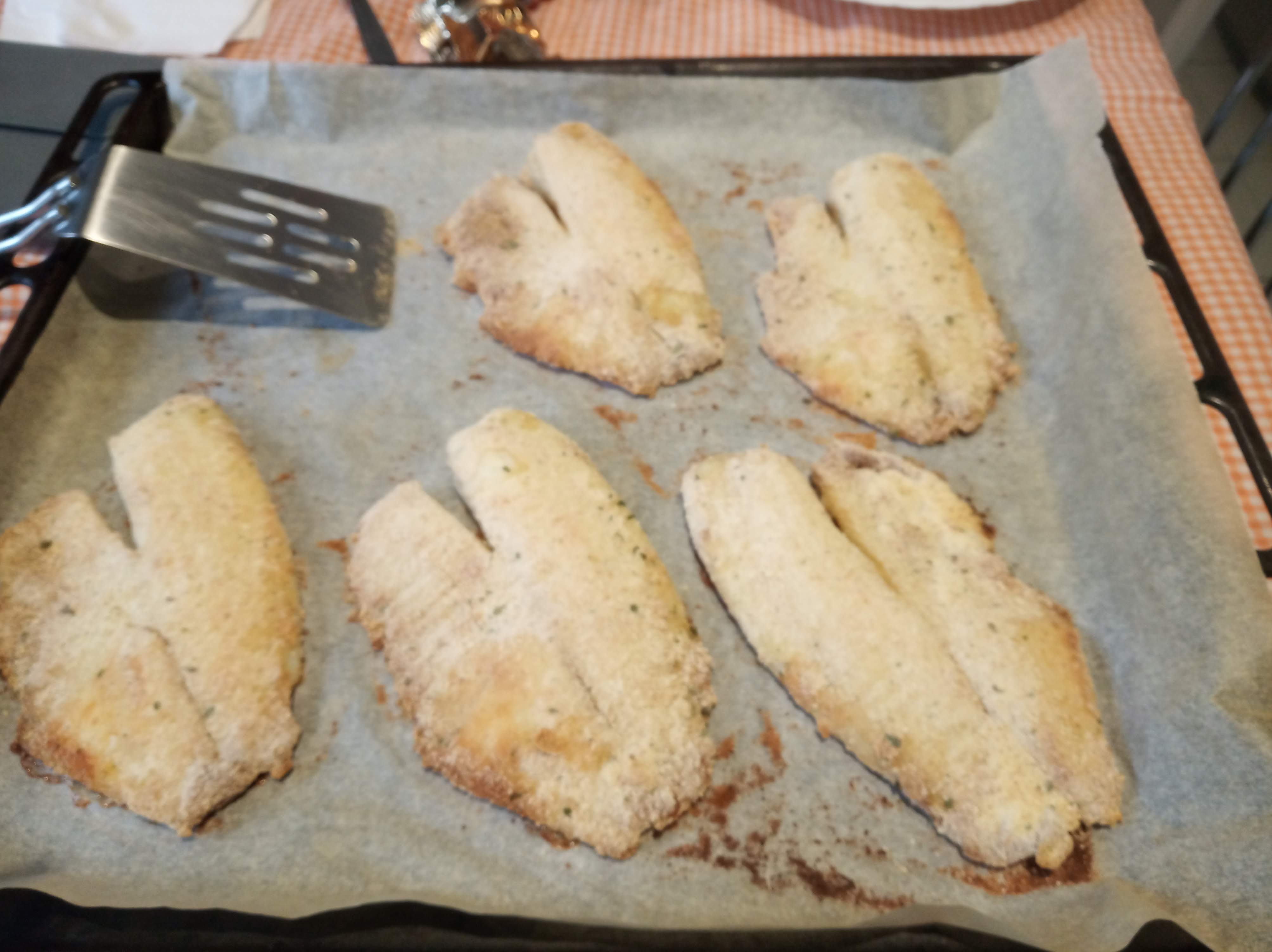 Pasamos los filetes de tilapia, primero por el huevo, escurrir muy bien, y después por el pan rallado, sacudiendo que quede los más liso posible.