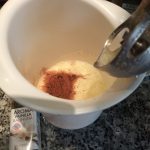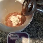 Añadimos una cucharada de cacao en polvo y 2 de esencia de vainilla, batir.