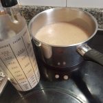 Poner a calentar el cazo, y no dejar de mover de vez en cuando, hasta que se ve que empieza a hervir y espesar. Retirar y batir muy bien.