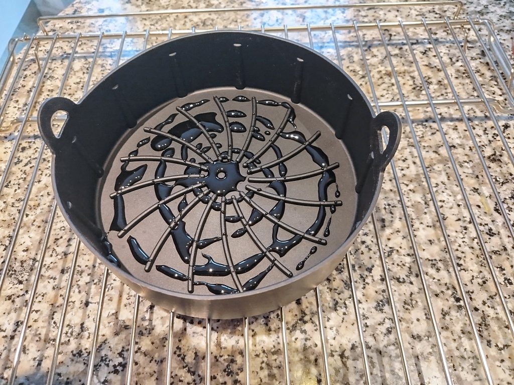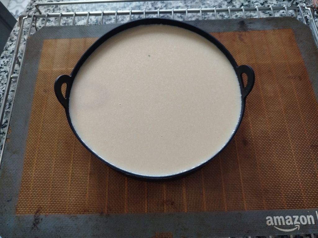 Echar en el molde un fondo de caramelo liquido y colocar sobre la rejilla el molde, con un tapete de silicona debajo, o papel de horno.