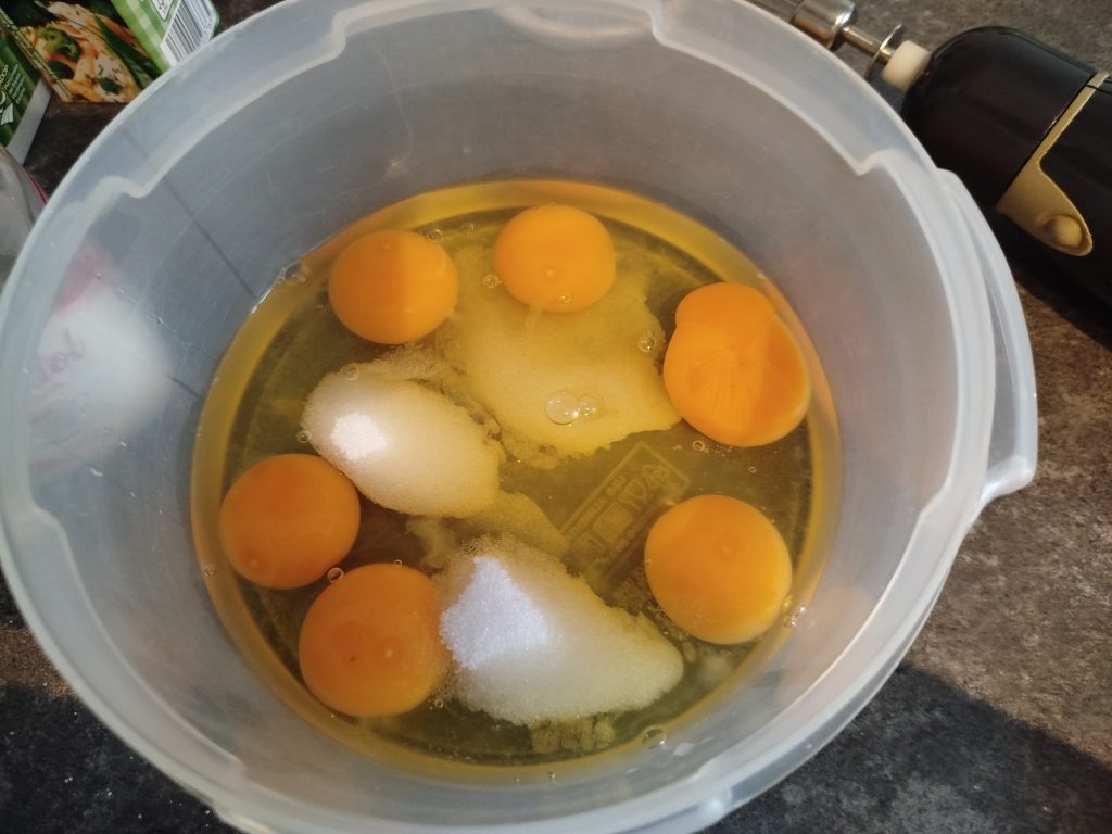 En un bol echar los huevos y el Eritritol, batir con varilla, hasta que cambien de color.