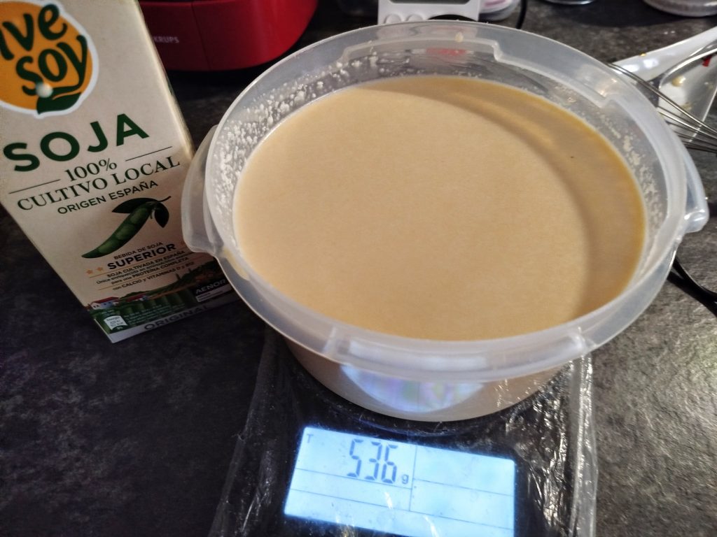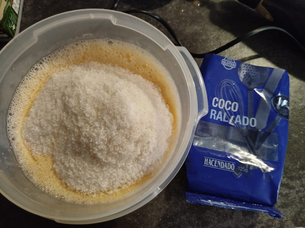 Por ultimo, echar el coco rallado, volver a mezclar y añadir medio litro de Bebida de Soja.