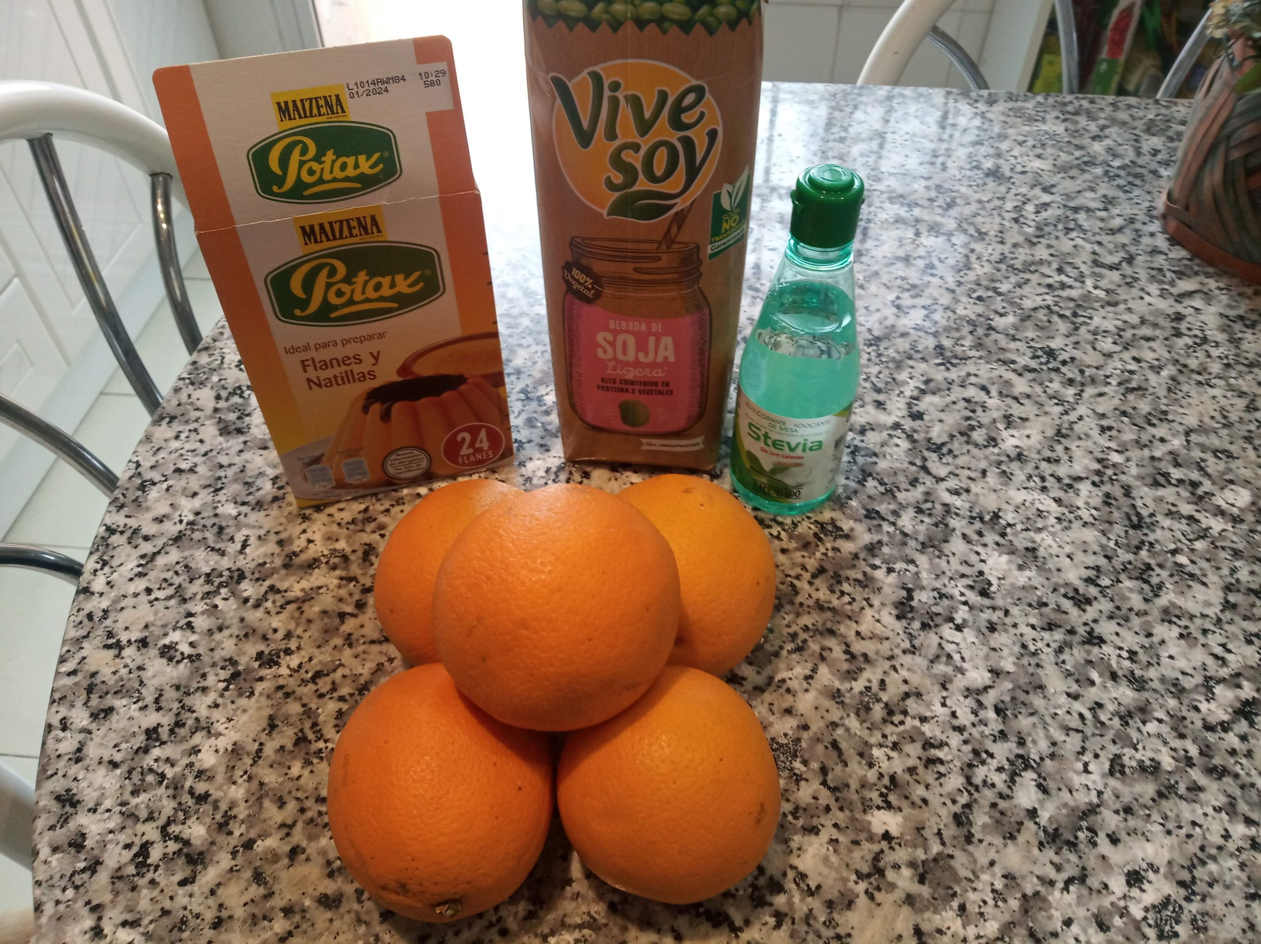 Receta tomada de Flan Potax con galletas, sustituyendo parte de la leche por zumo de naranja o clementina.