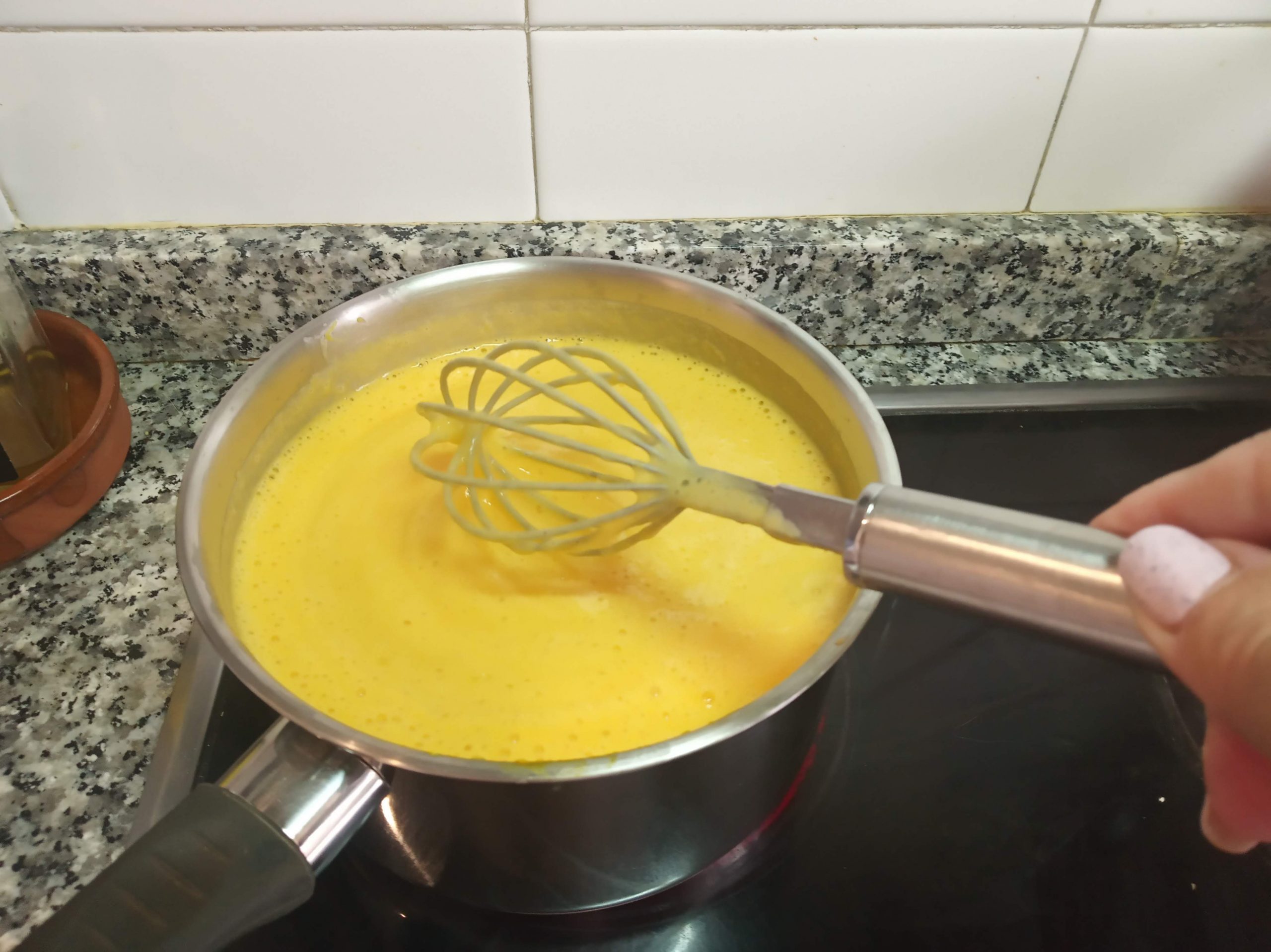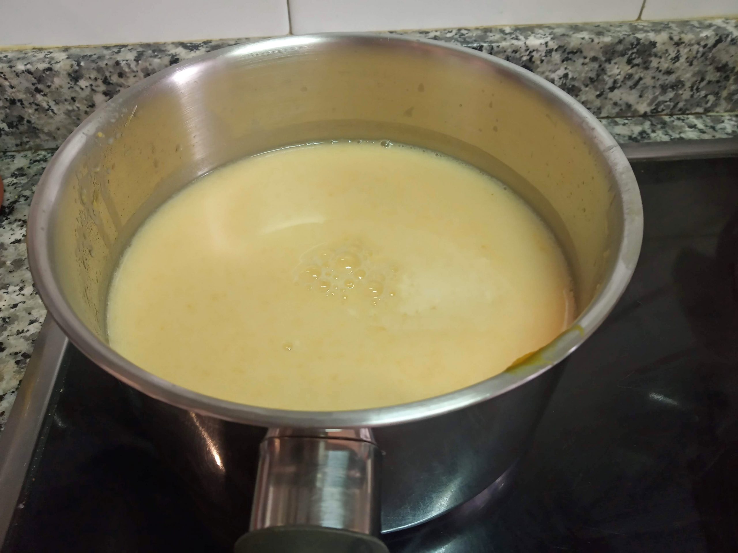 Cuando la leche empiece a hervir, batiéndolo con unas varillas, se le va añadiendo la mezcla del flan batida.