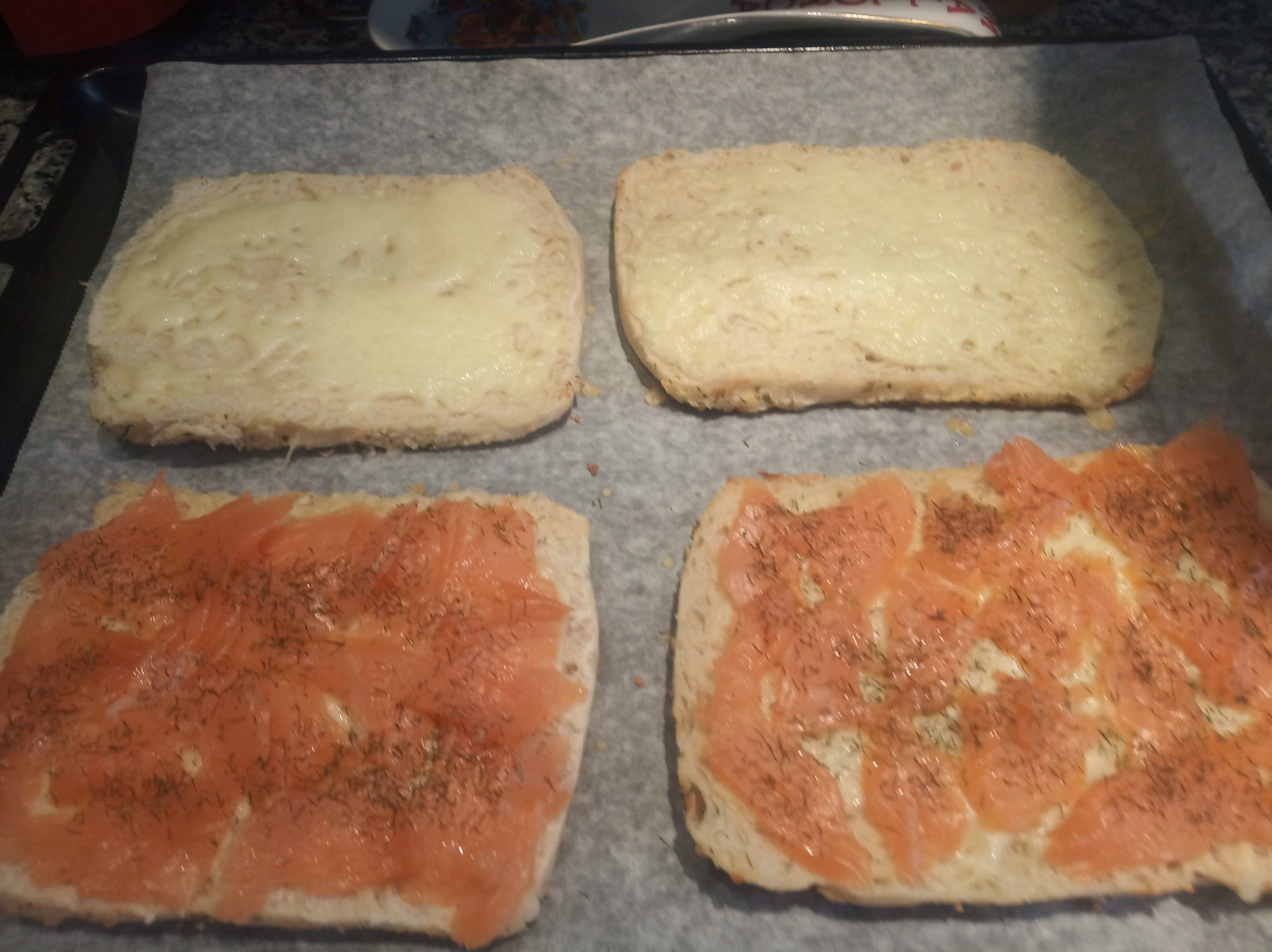 Sacar la bandeja y repartir por encima, el salmón ahumado troceado, solo en la parte de debajo de la Focaccia, echar por encima eneldo picado, fresco o de bote.