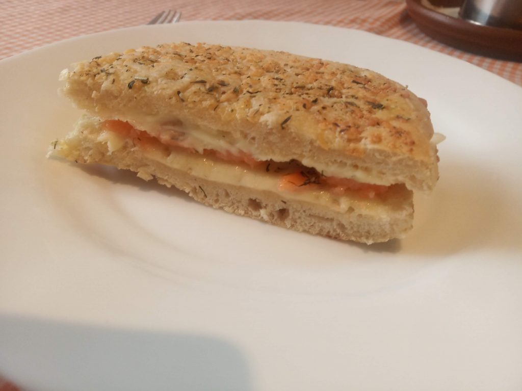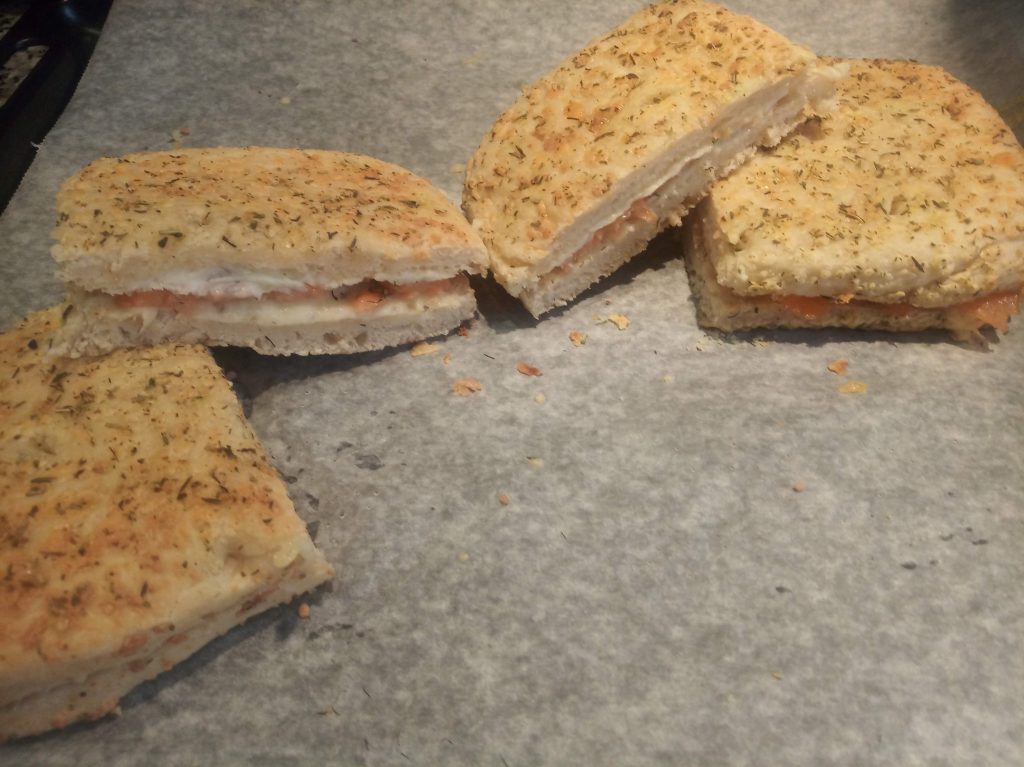 Poner encima la parte de arriba de cada Focaccia y cortar por la mitad.