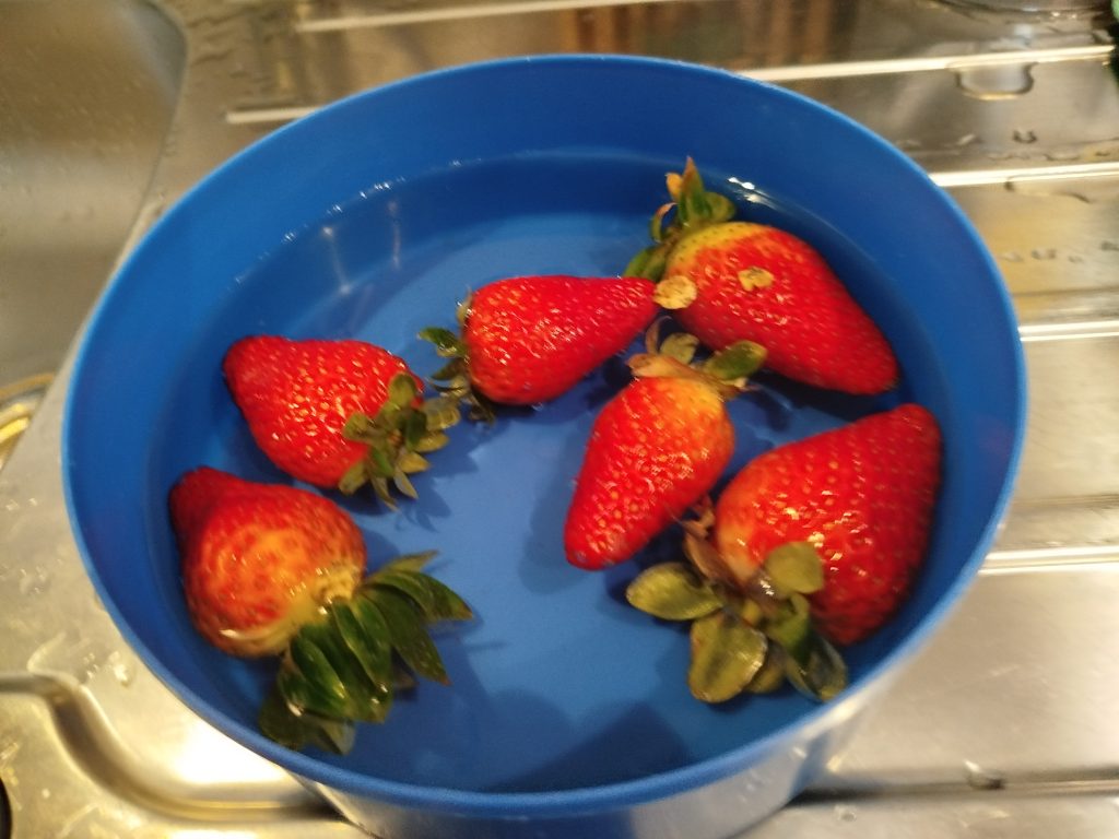 Poner unos 160 gramos de fresas en un táper y cubrir con agua, dejar mínimo una hora.