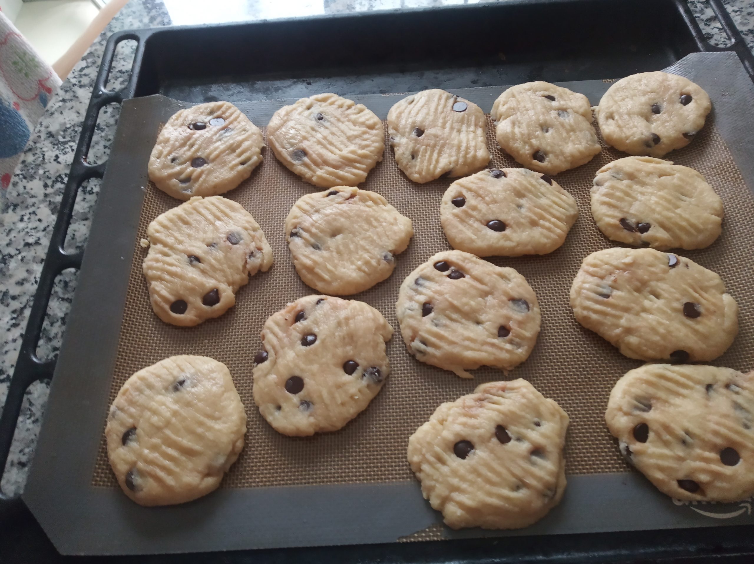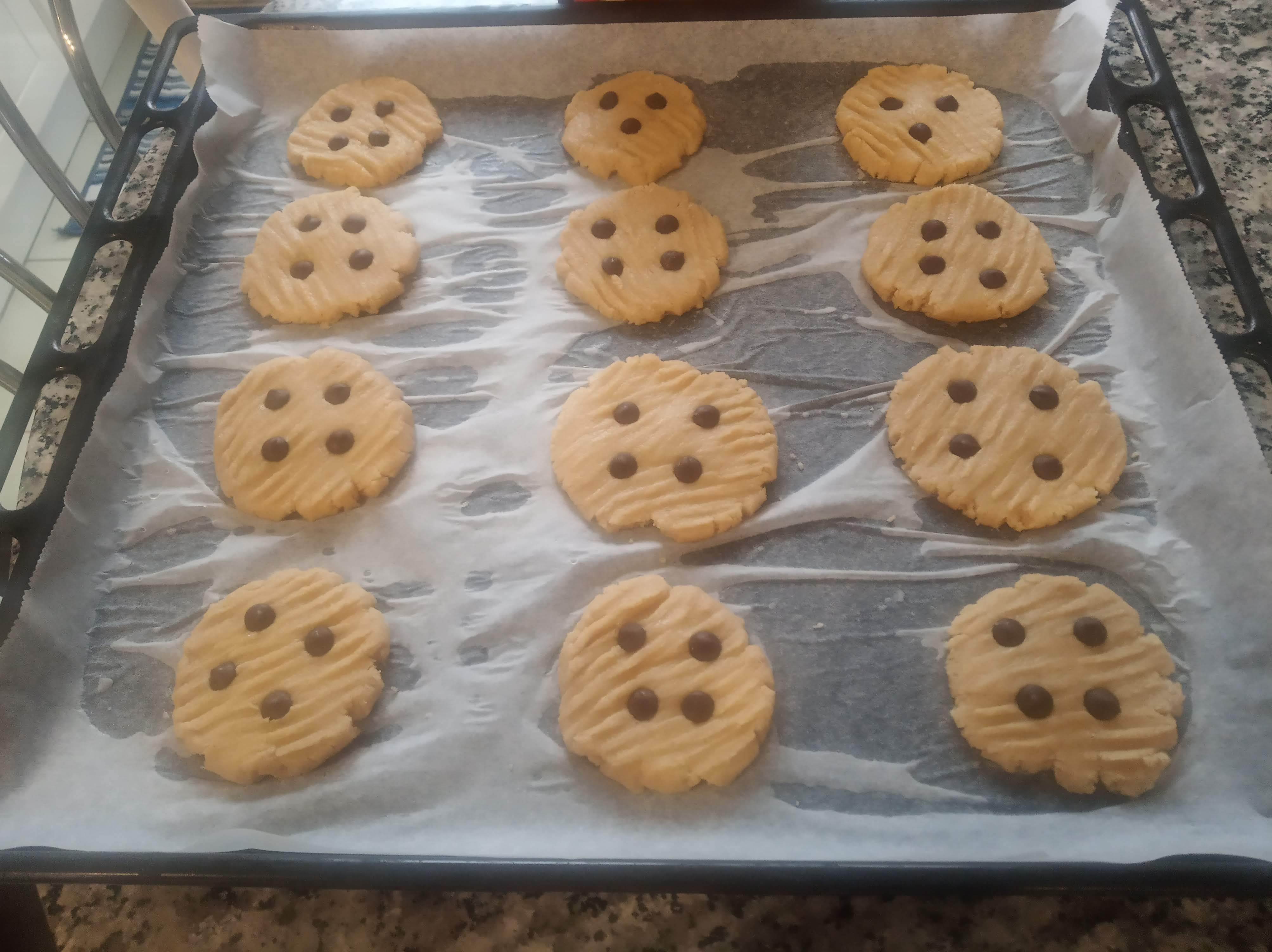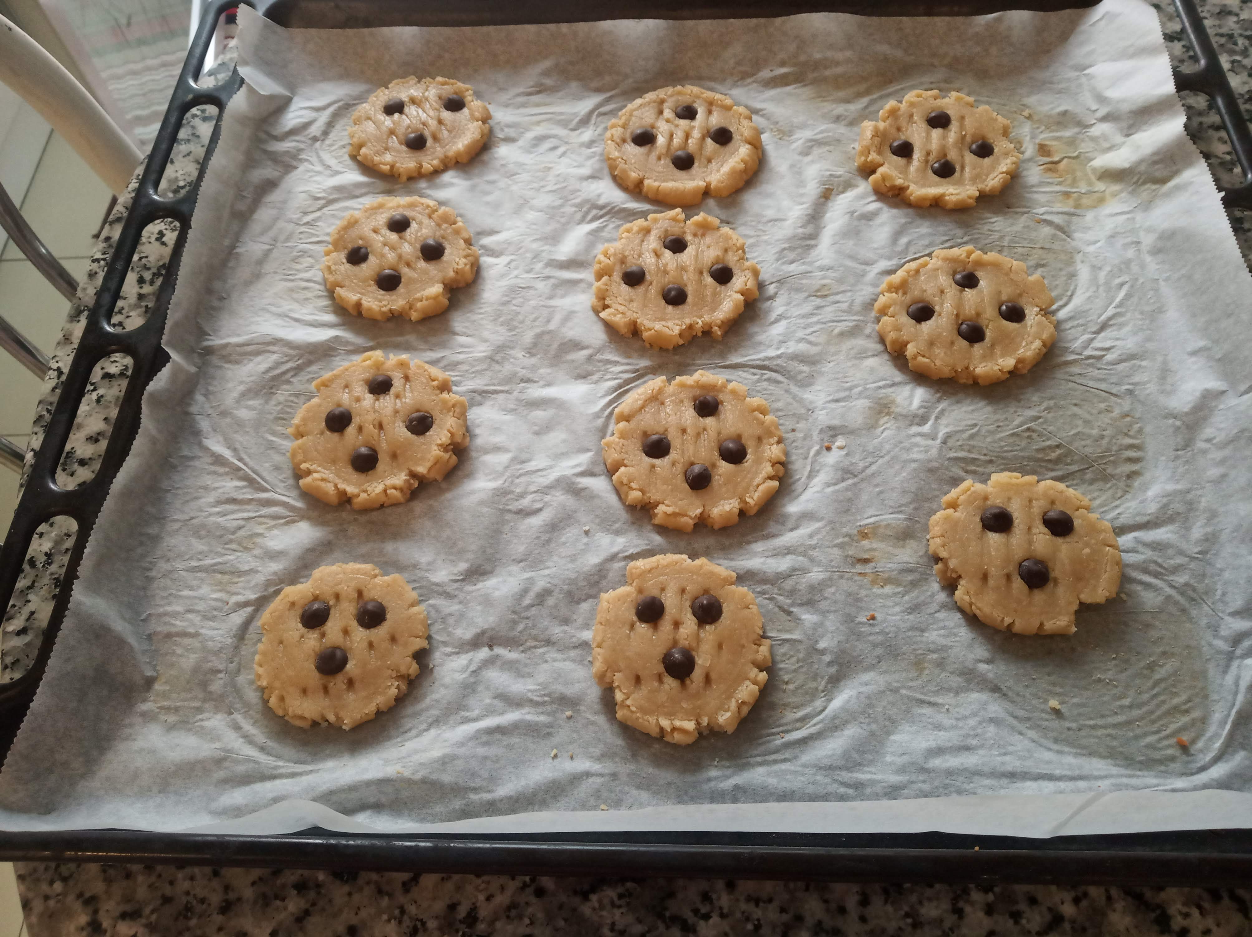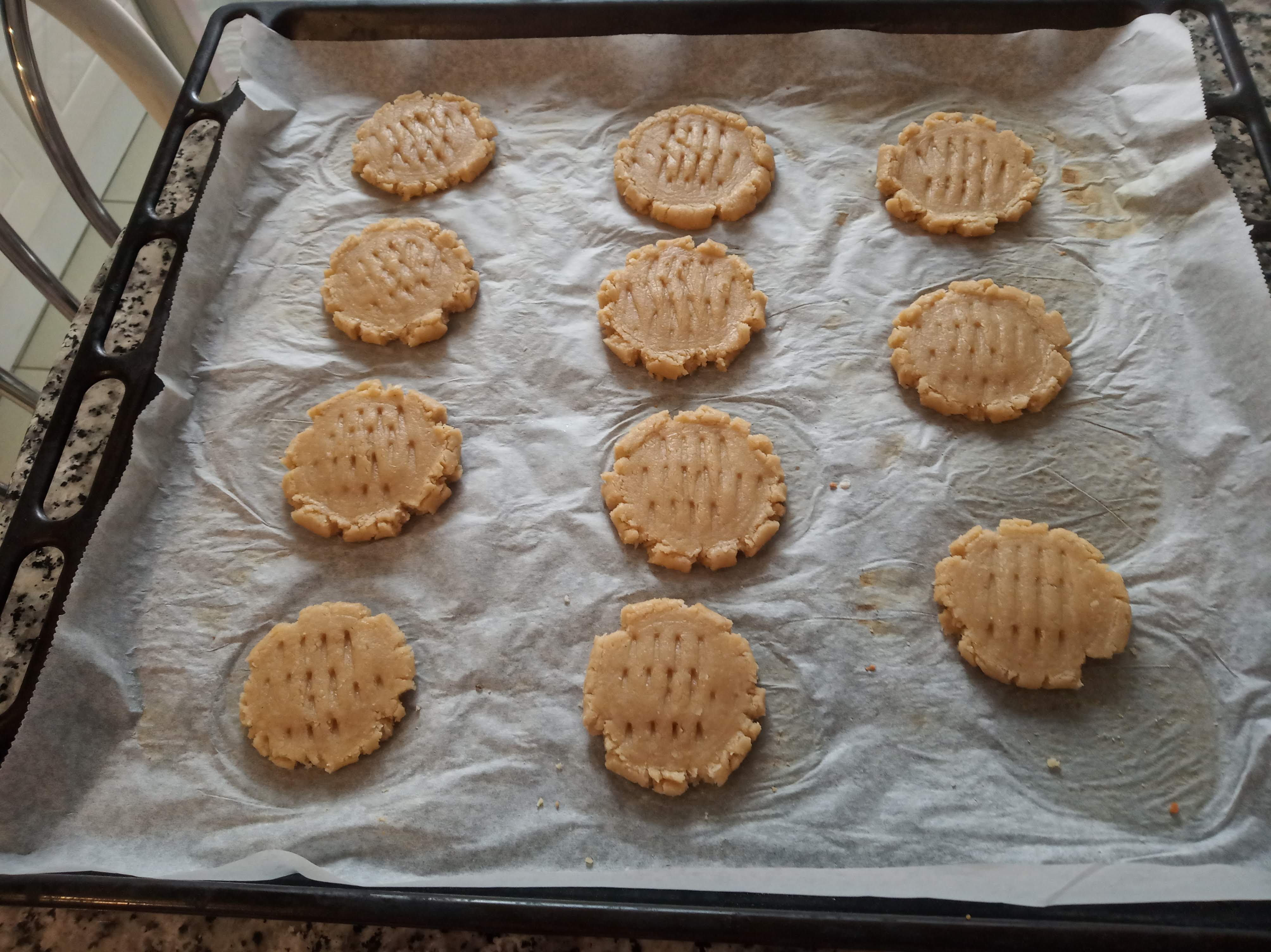 Aplastar las bolitas con un tenedor, no importa que deje marcas, dejando el tamaño y altura que queramos, pues no suben al hornearlas.