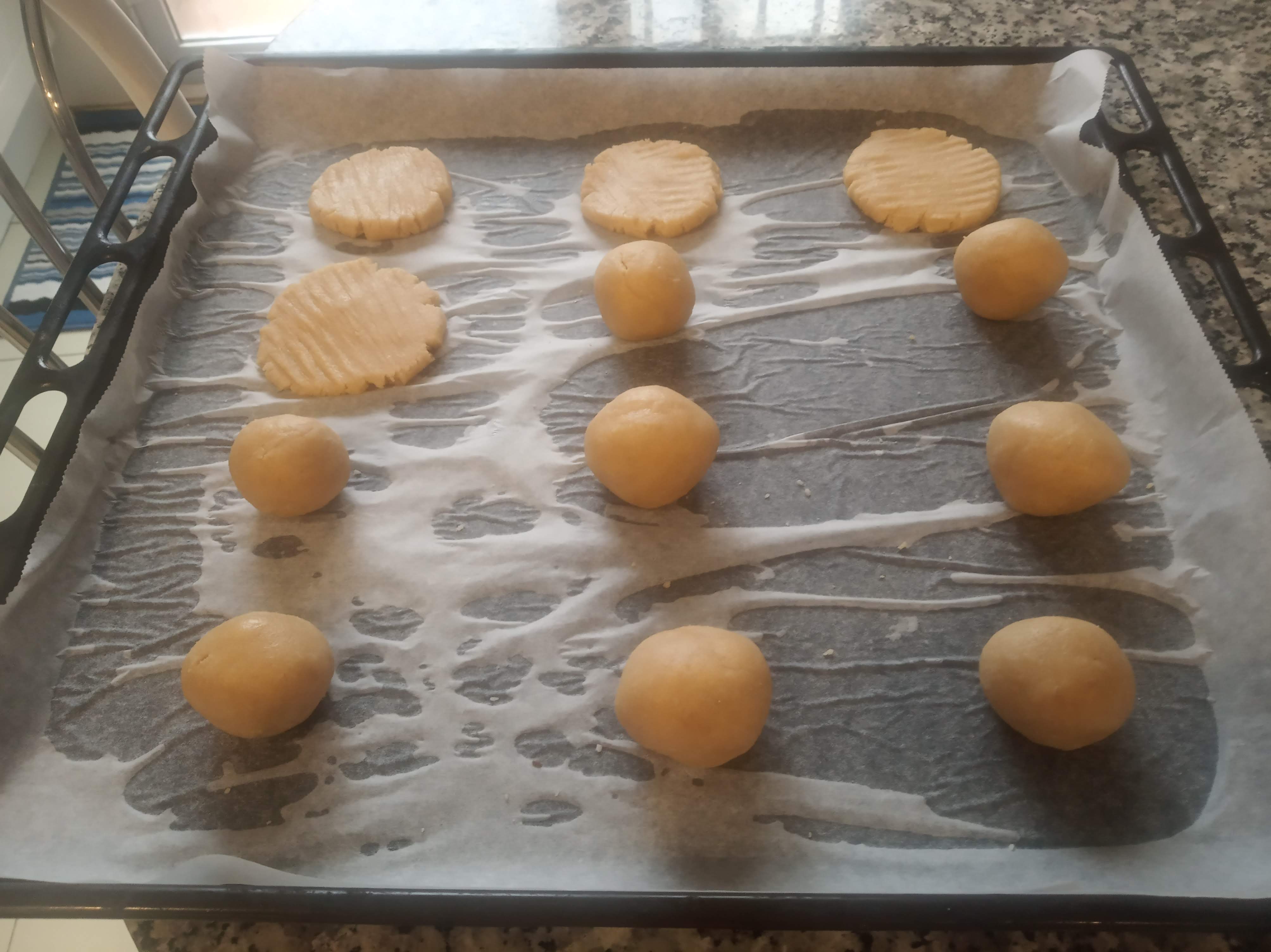 Ir haciendo bolitas y colocándolas encima del papel vegetal, separado un poco, porque luego hay que aplastarlas.