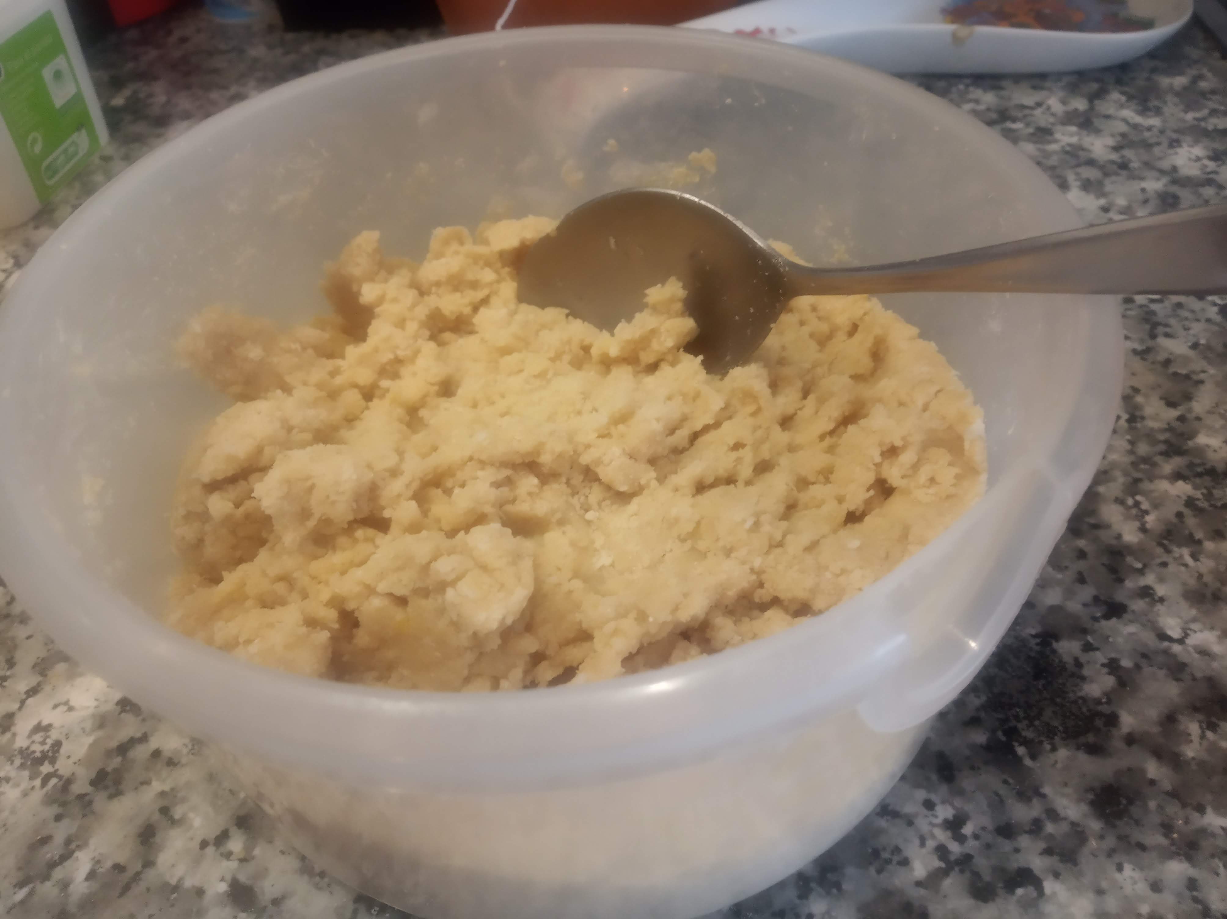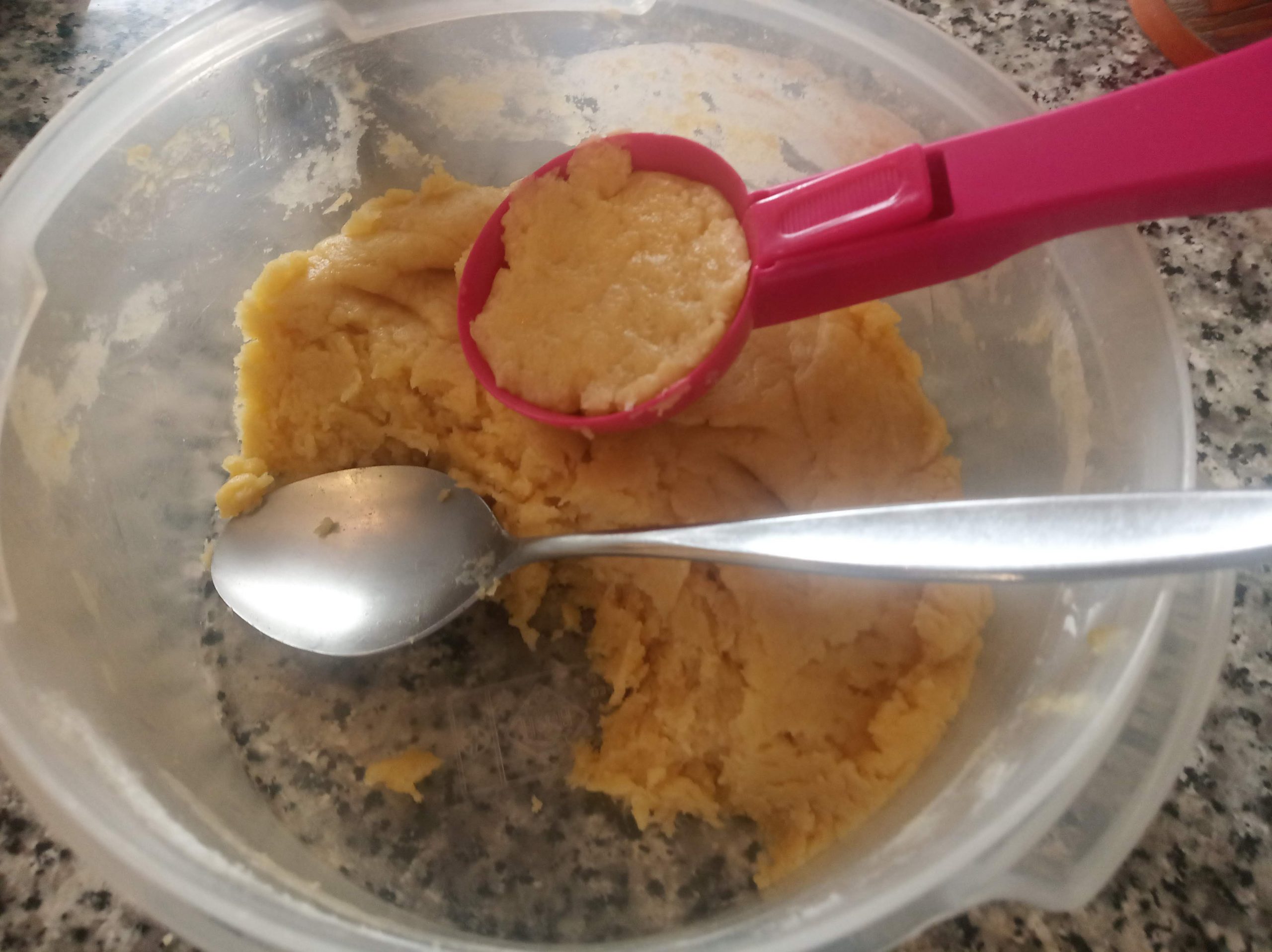 Remover y mezclar todo muy bien despacio con una cuchara o brazo de amasar, hasta que esté todo muy bien ligado, de forma que no se pegue a las manos y al aplastarlo quede liso.