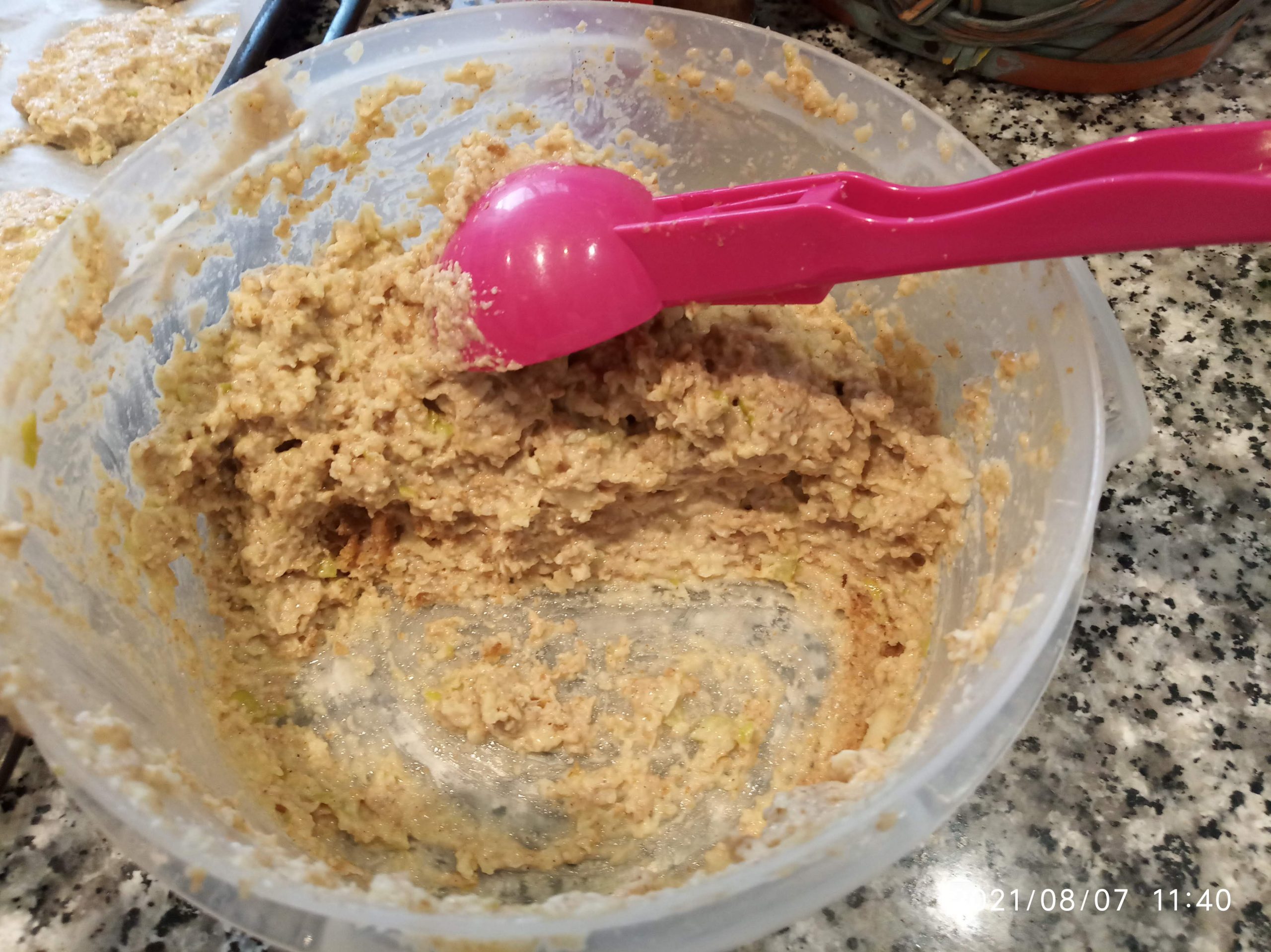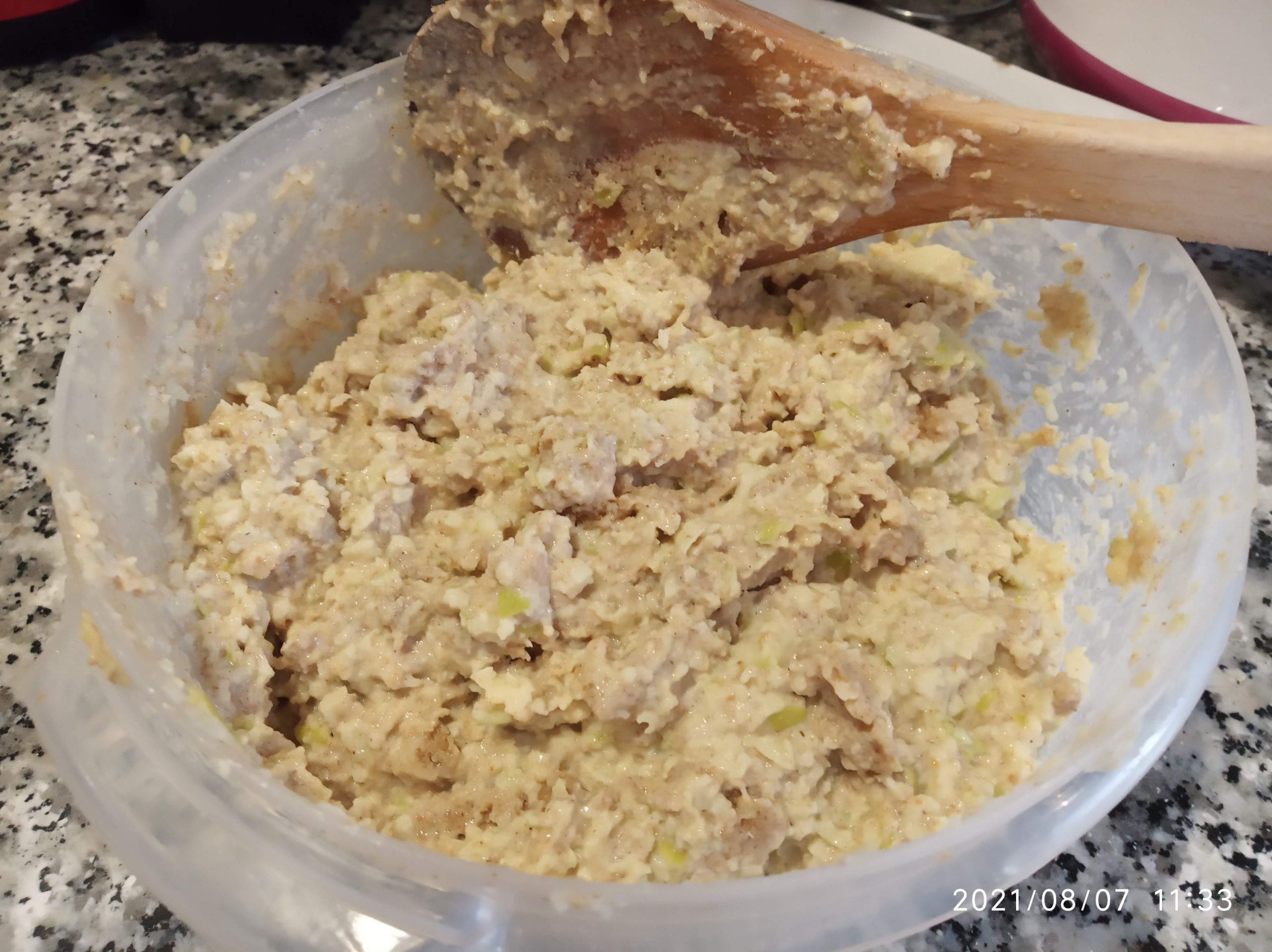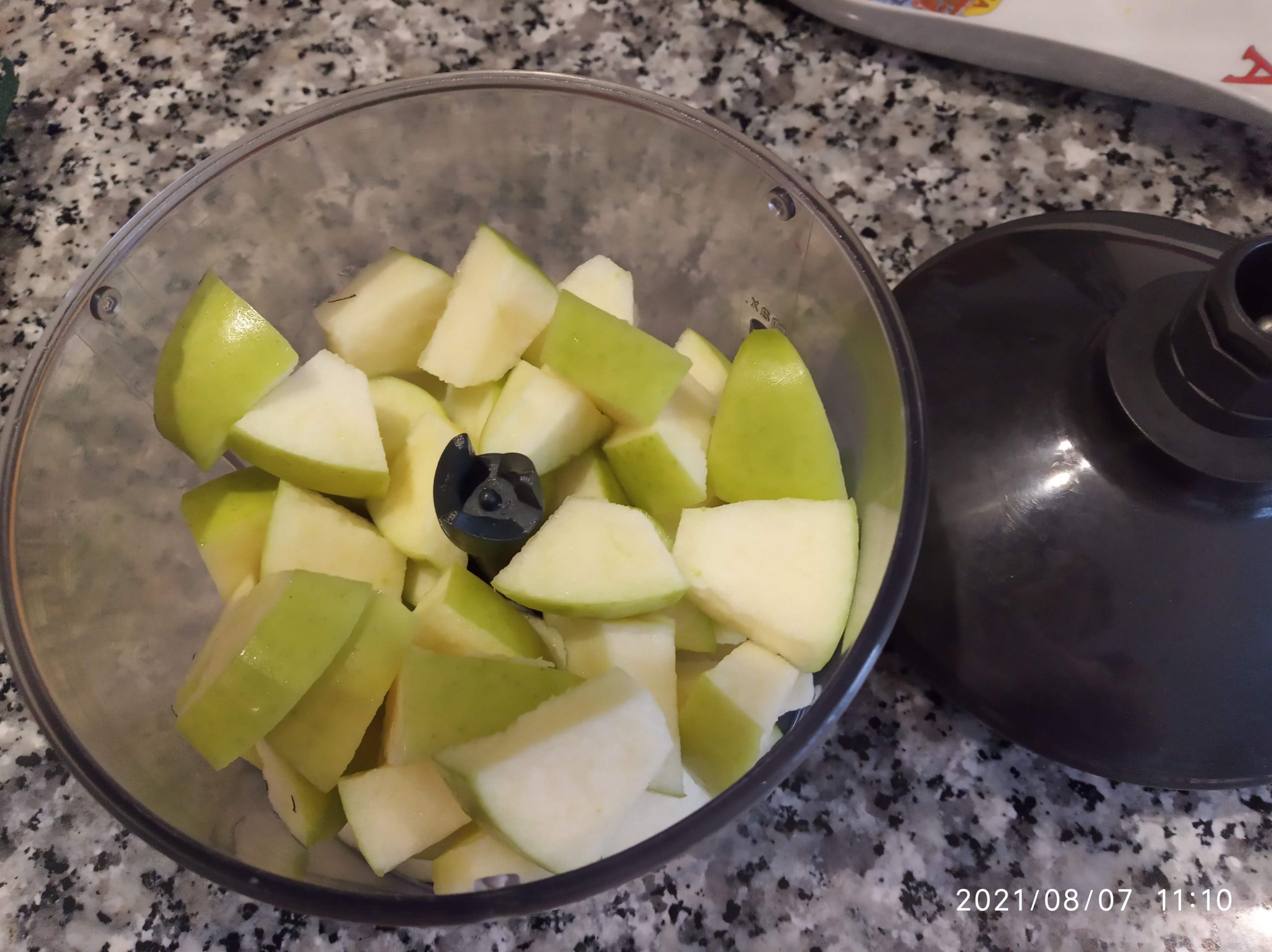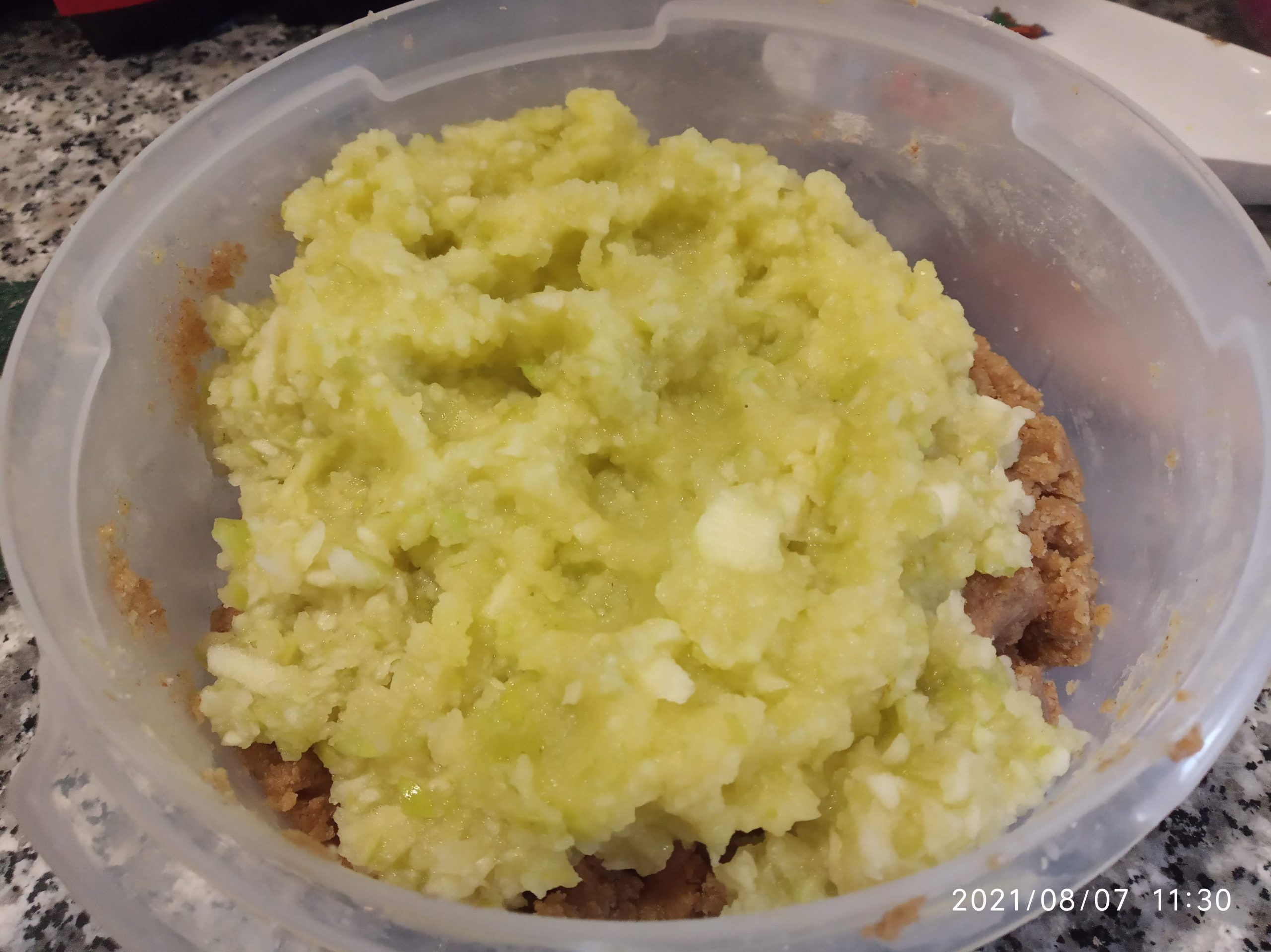 Lavamos y Troceamos las manzanas con piel, y las terminamos de picar más en una picadora. Se lo añadimos a la masa, y mezclar todo muy bien.