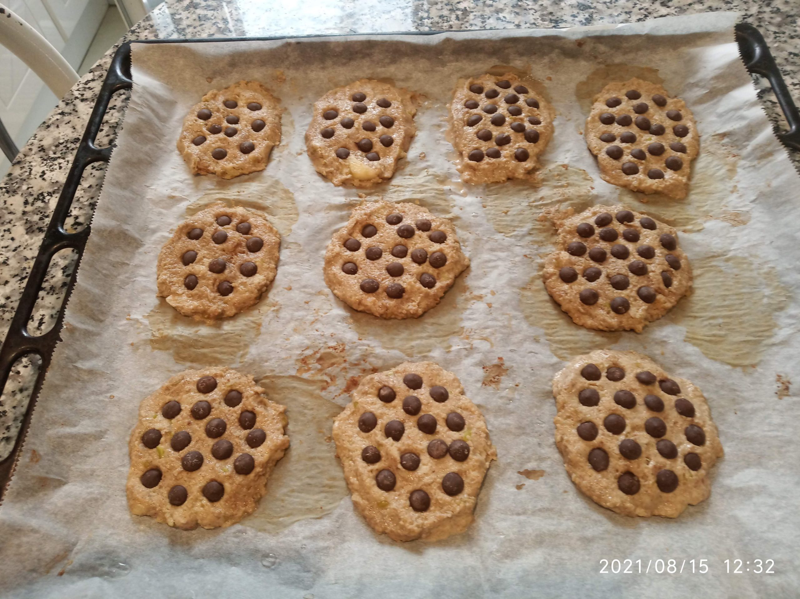 En la fuente de horno sobre papel de hornear, vamos poniendo montoncitos más o menos del mismo tamaño, se puede hacer en dos tandas. Colocamos encima perlitas de chocolate.