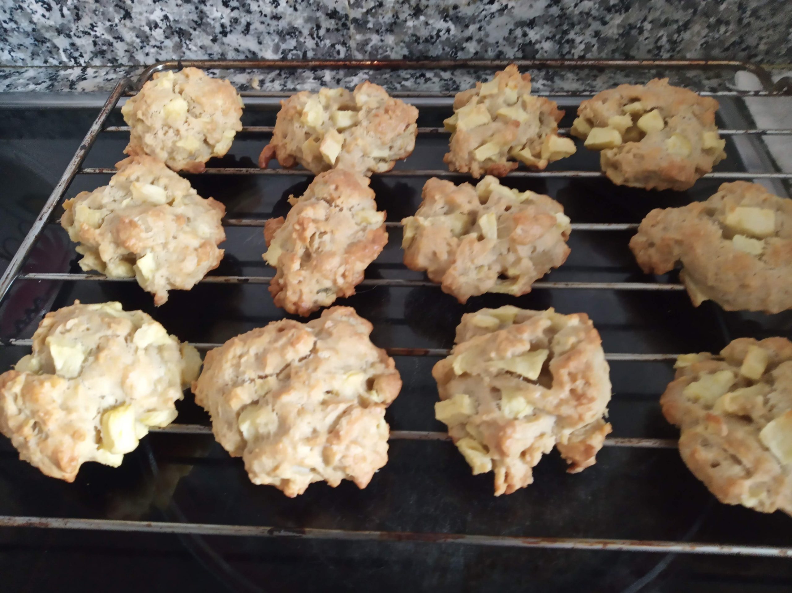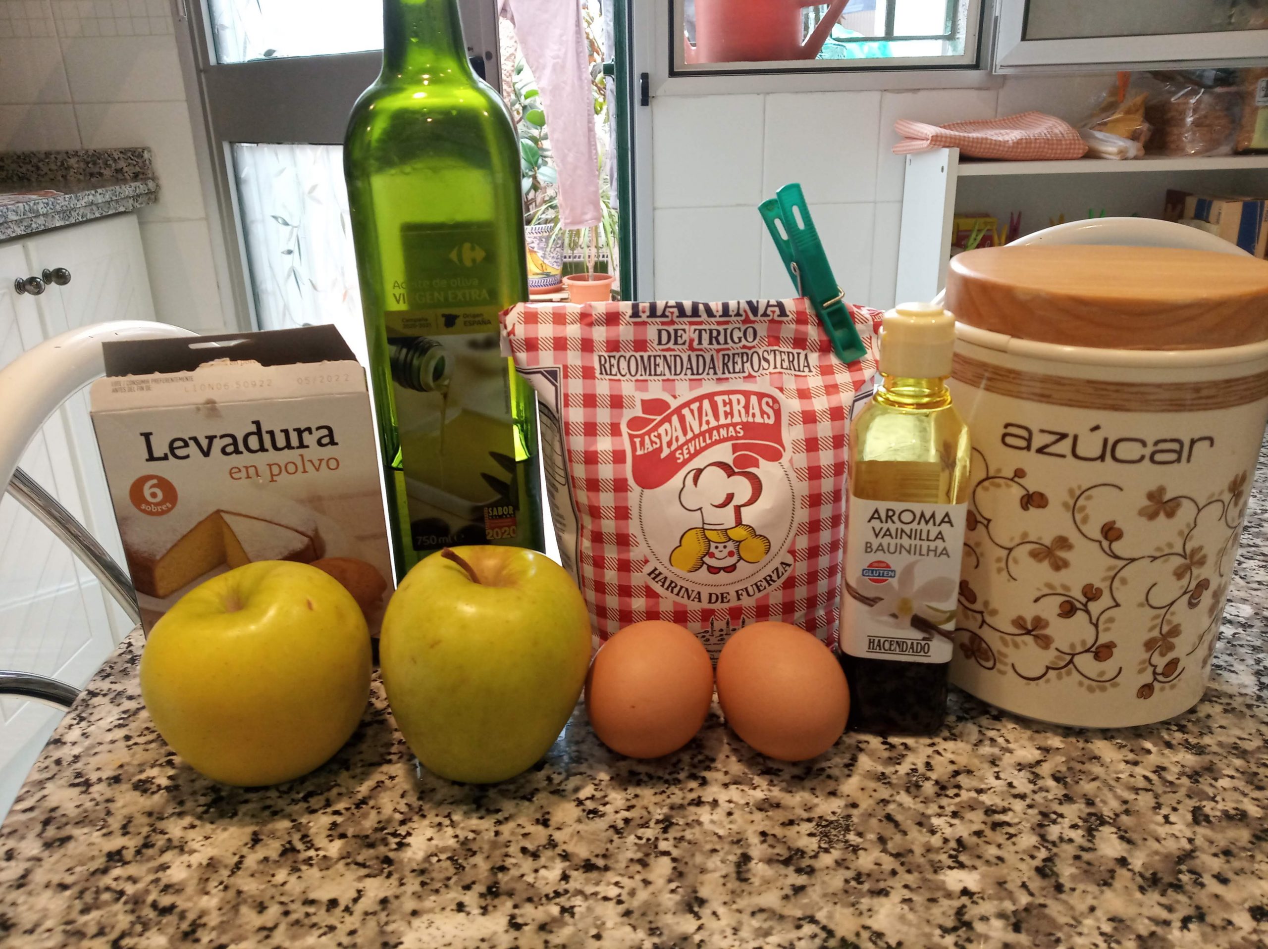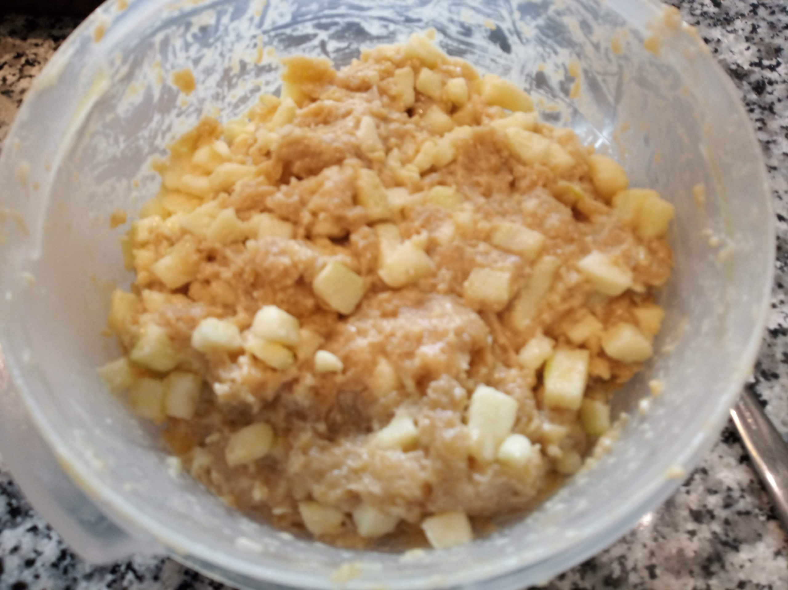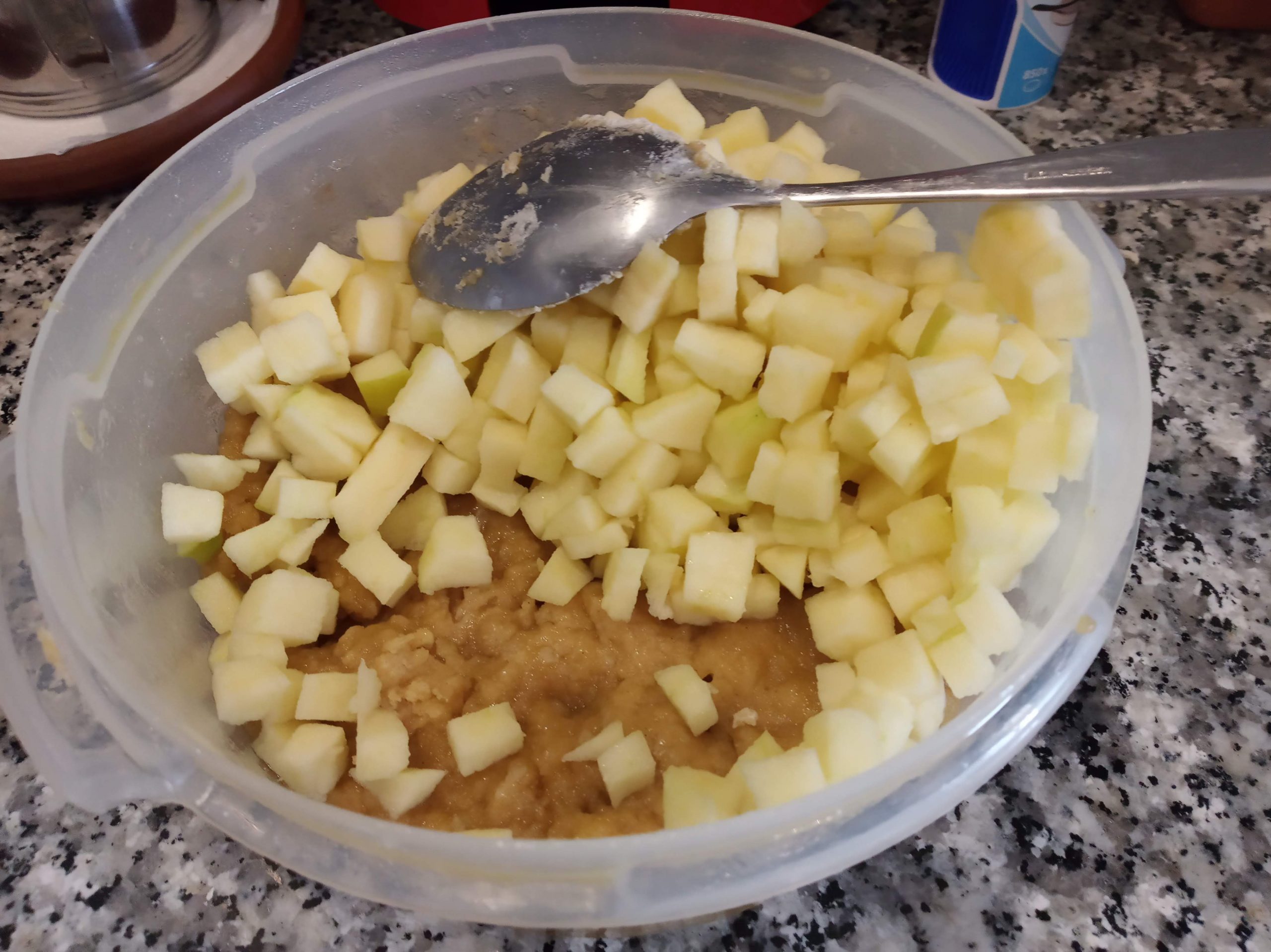 Pelamos y troceamos las manzanas en trozos chicos. Se lo añadimos a la masa, y mezclar todo muy bien.