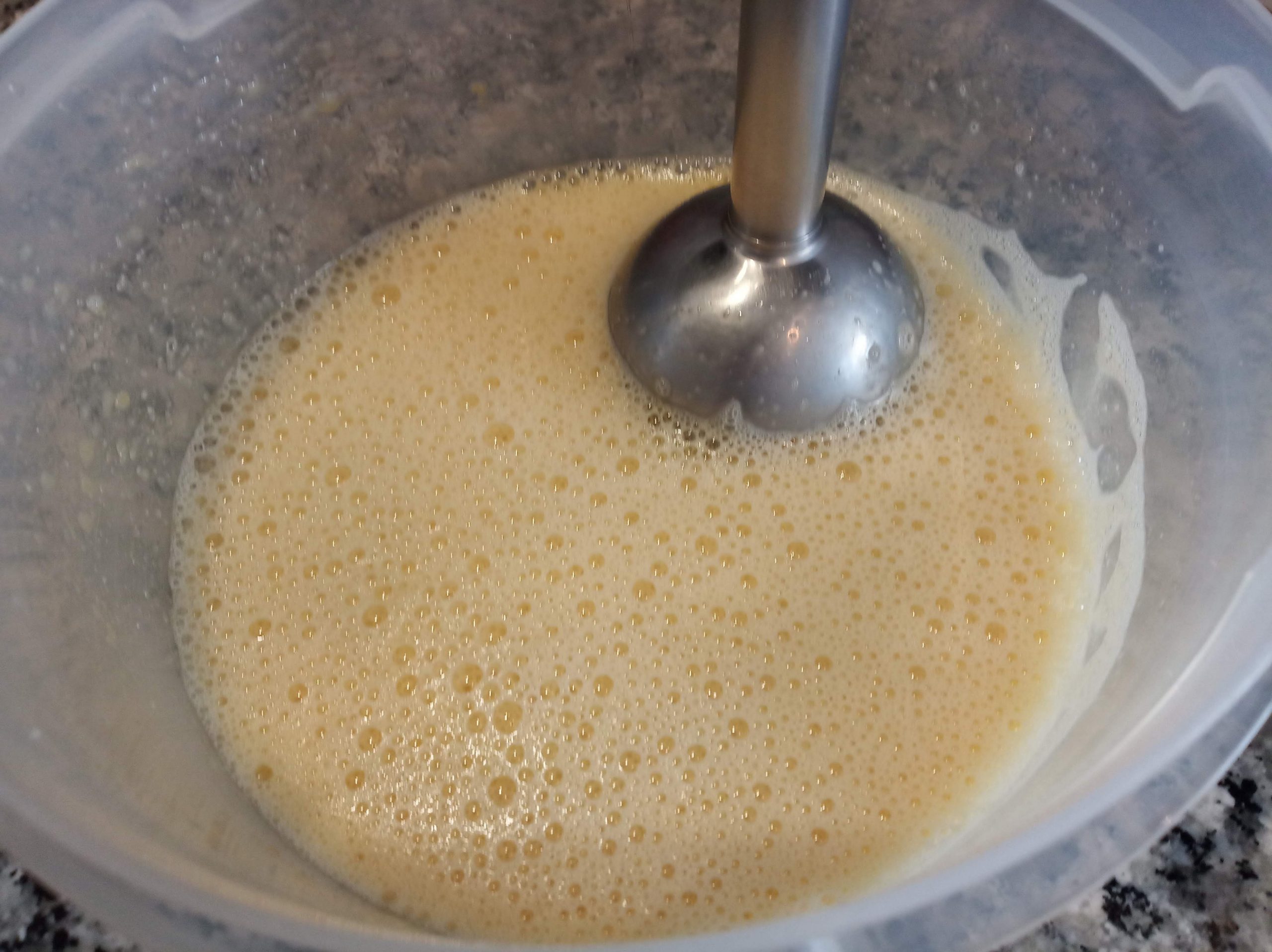 En un bol echamos los huevos, el azúcar, la sal, la esencia de vainilla, y batir todos muy bien hasta que quede blanco y con espumas.