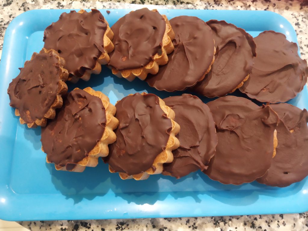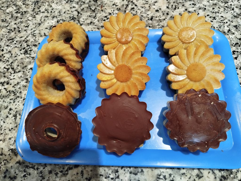 Hornear a 180ºC con calor arriba y abajo, durante 15 ó 20 minutos. Pinchar y ver que sale limpia. La temperatura puede variar, si son galletas más finas.
