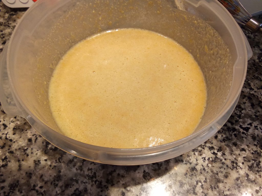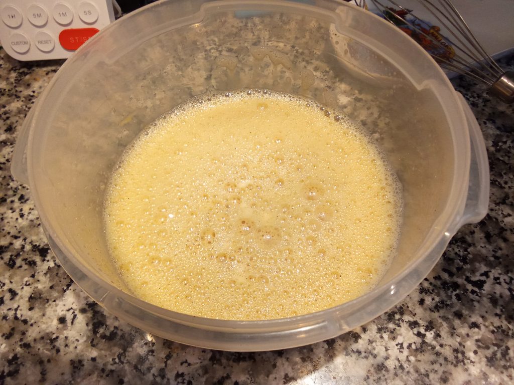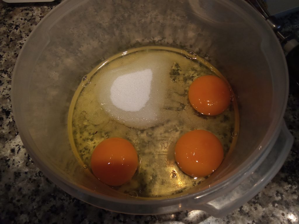 En un bol, echamos los huevos y el azúcar, y batimos hasta que blanquee.