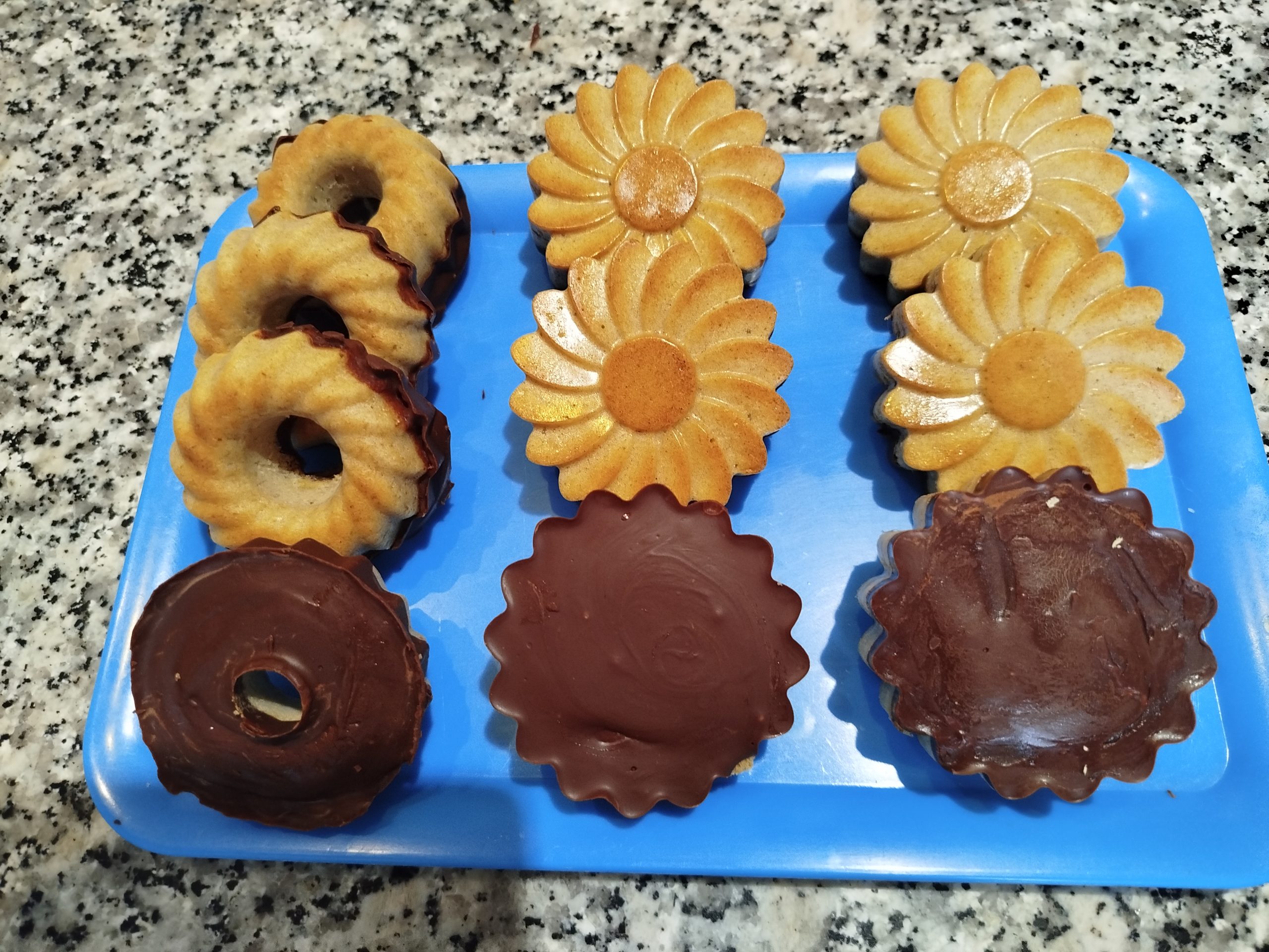 Hornear a 180ºC con calor arriba y abajo, durante 15 ó 20 minutos. Pinchar y ver que sale limpia. La temperatura puede variar, si son galletas más finas.