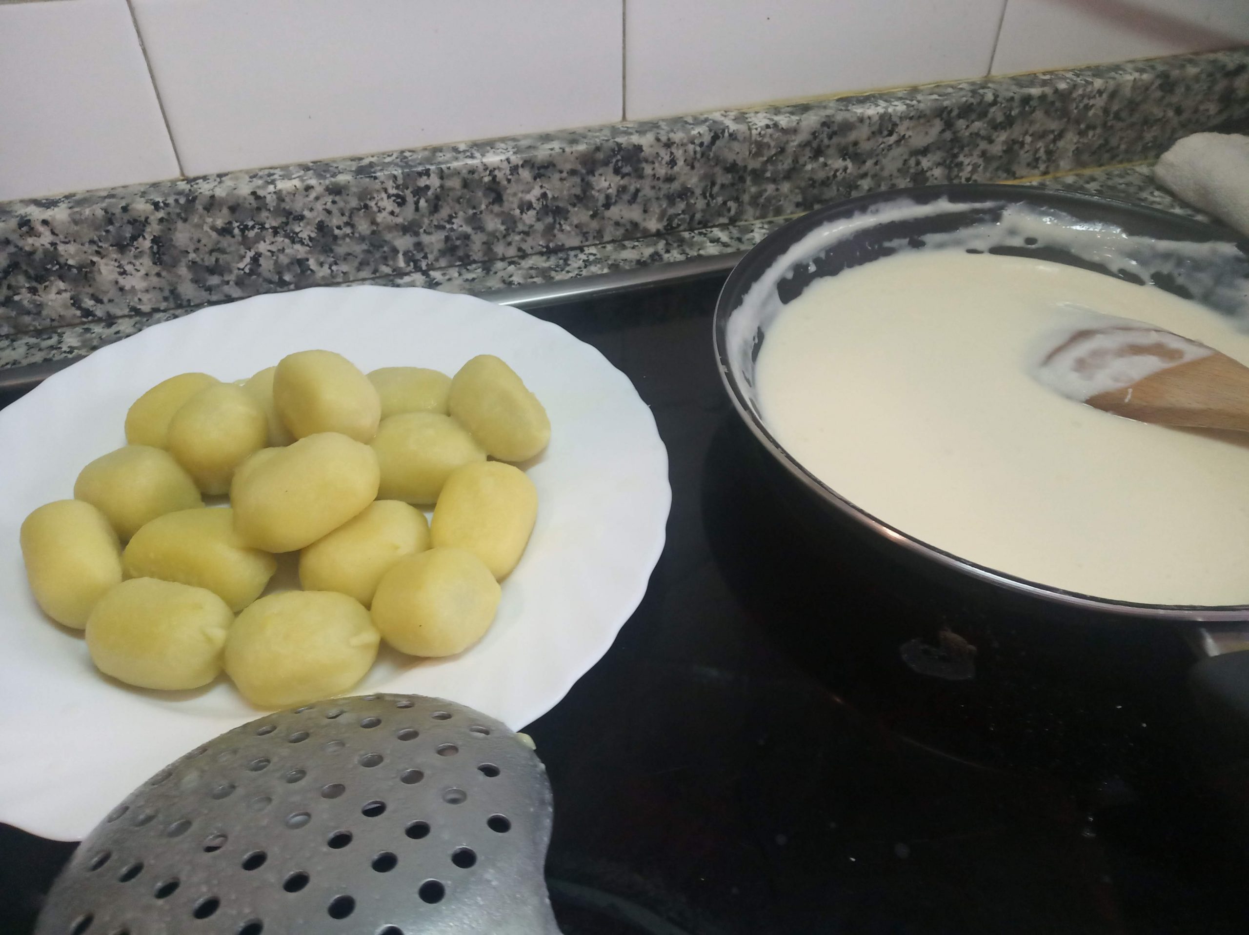 Cocer los Gnocchi al pesto como indica el paquete, yo suelo echarle un poco de agua en una sarten , los cuezos moviéndolos, los sacos, y si quieres puedes utilizar la misma sarten con el caldo que sobre para hacer la crema de queso.