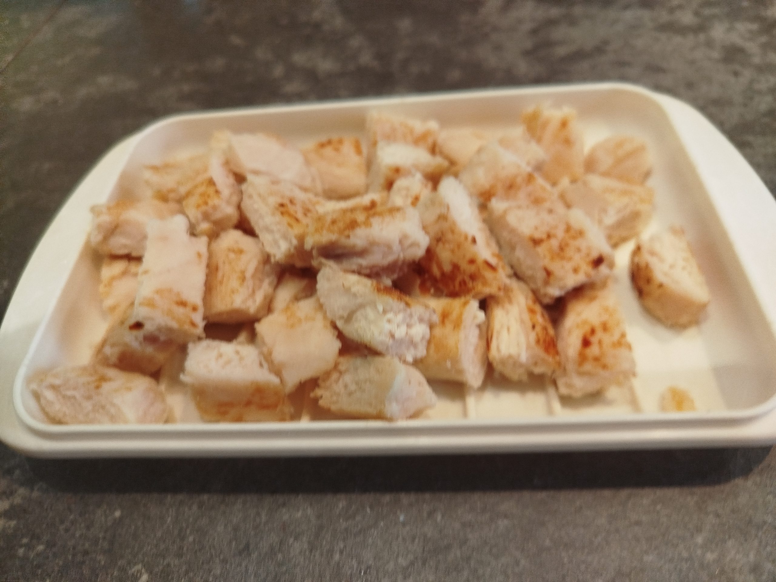 Descongelar el día anterior, los filetitos de pollo hechos, o puedes marcarlos tu si son frescos. Trocear el pollo en taquitos y reservar.