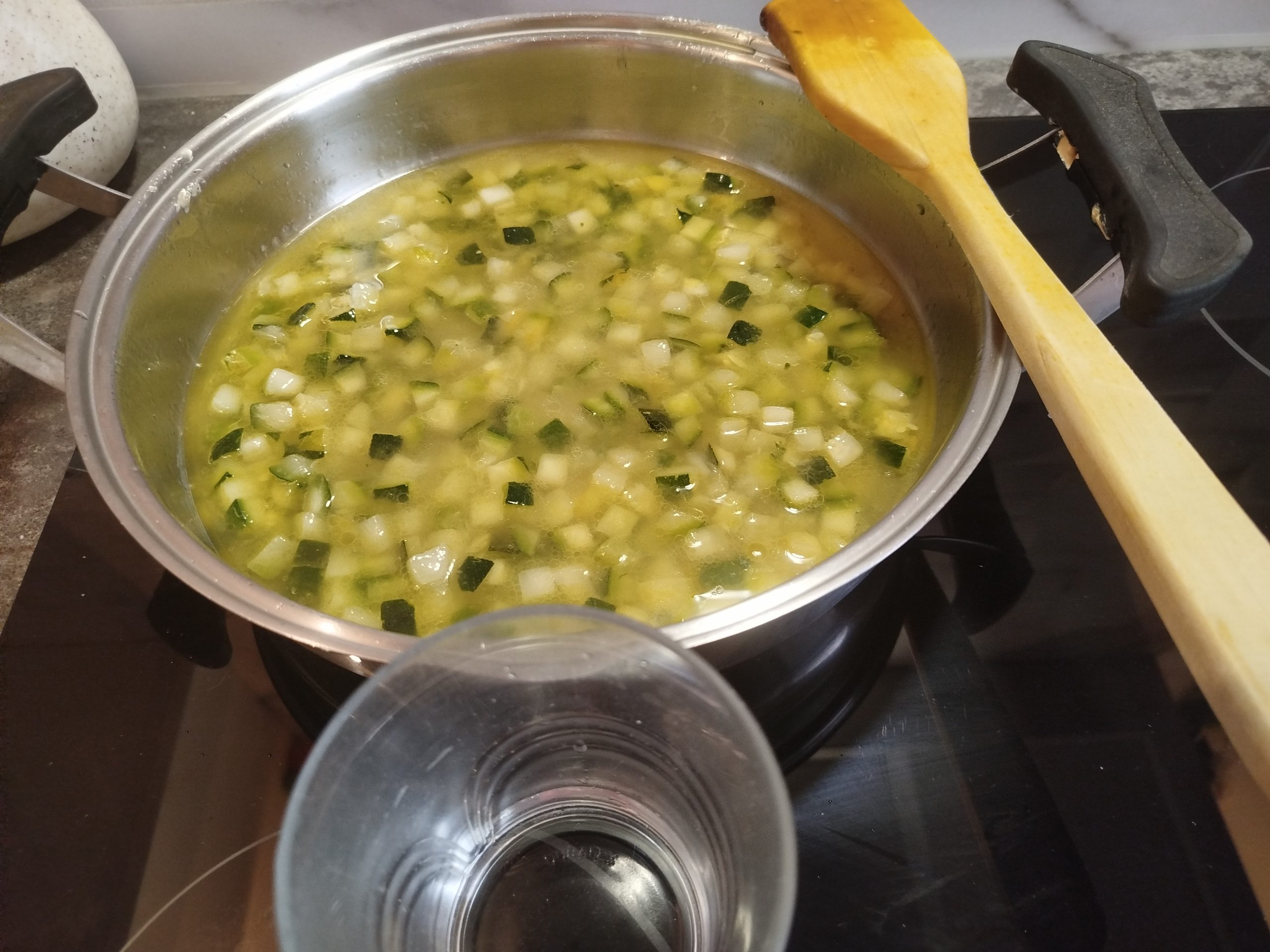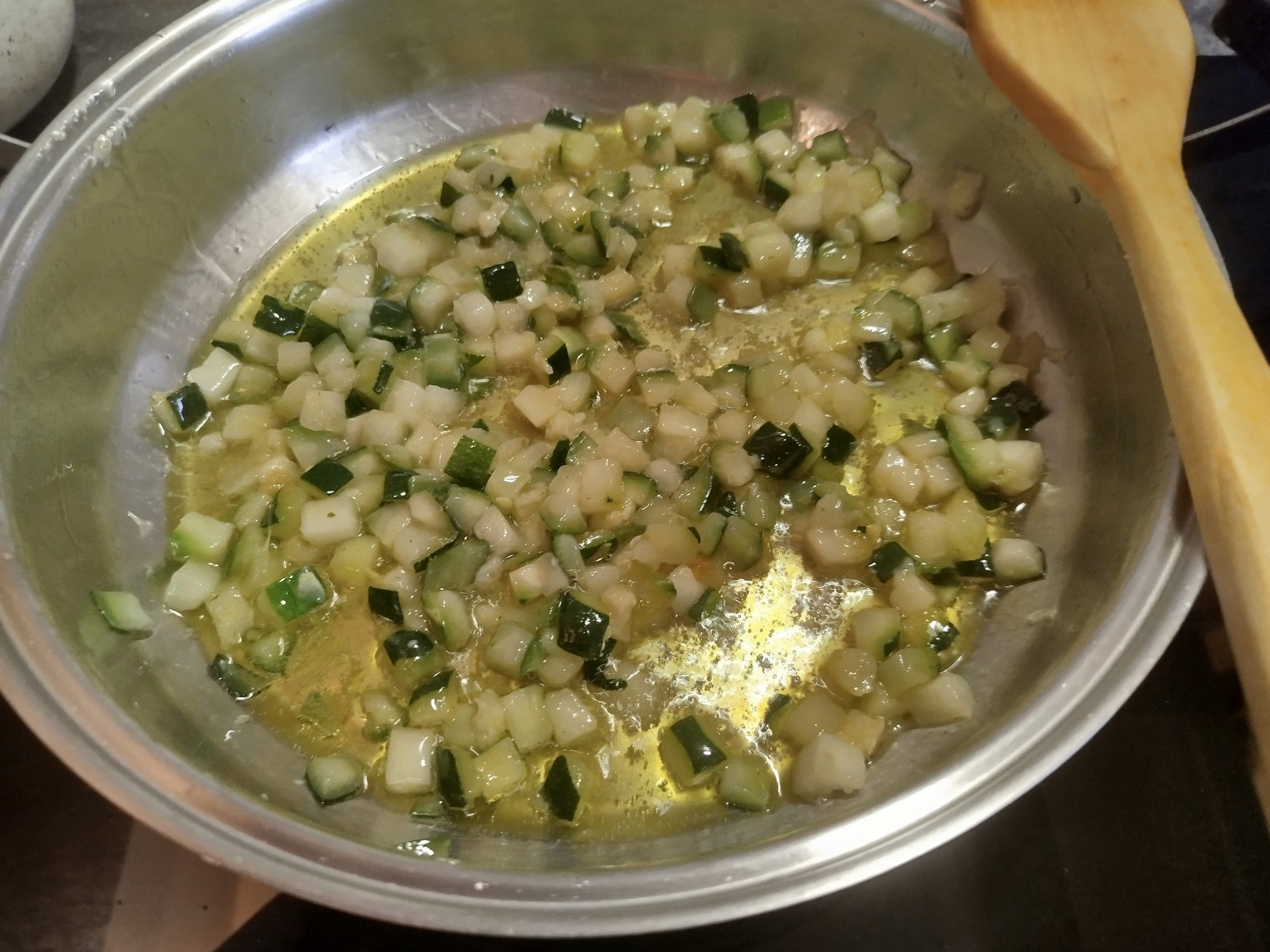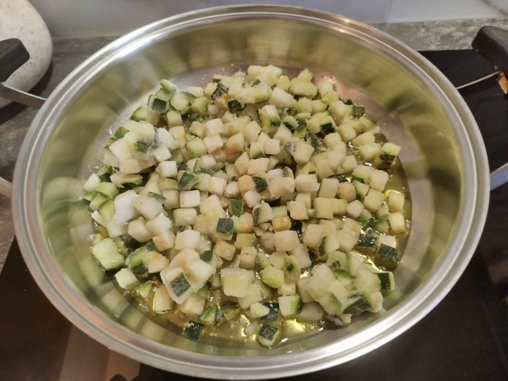 En una cacerola baja y grande, echar un fondo de aceite de oliva, y los calabacines en dados congelados o frescos, con un poco de sal y hacer hasta que estén tiernos.