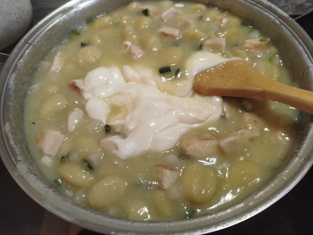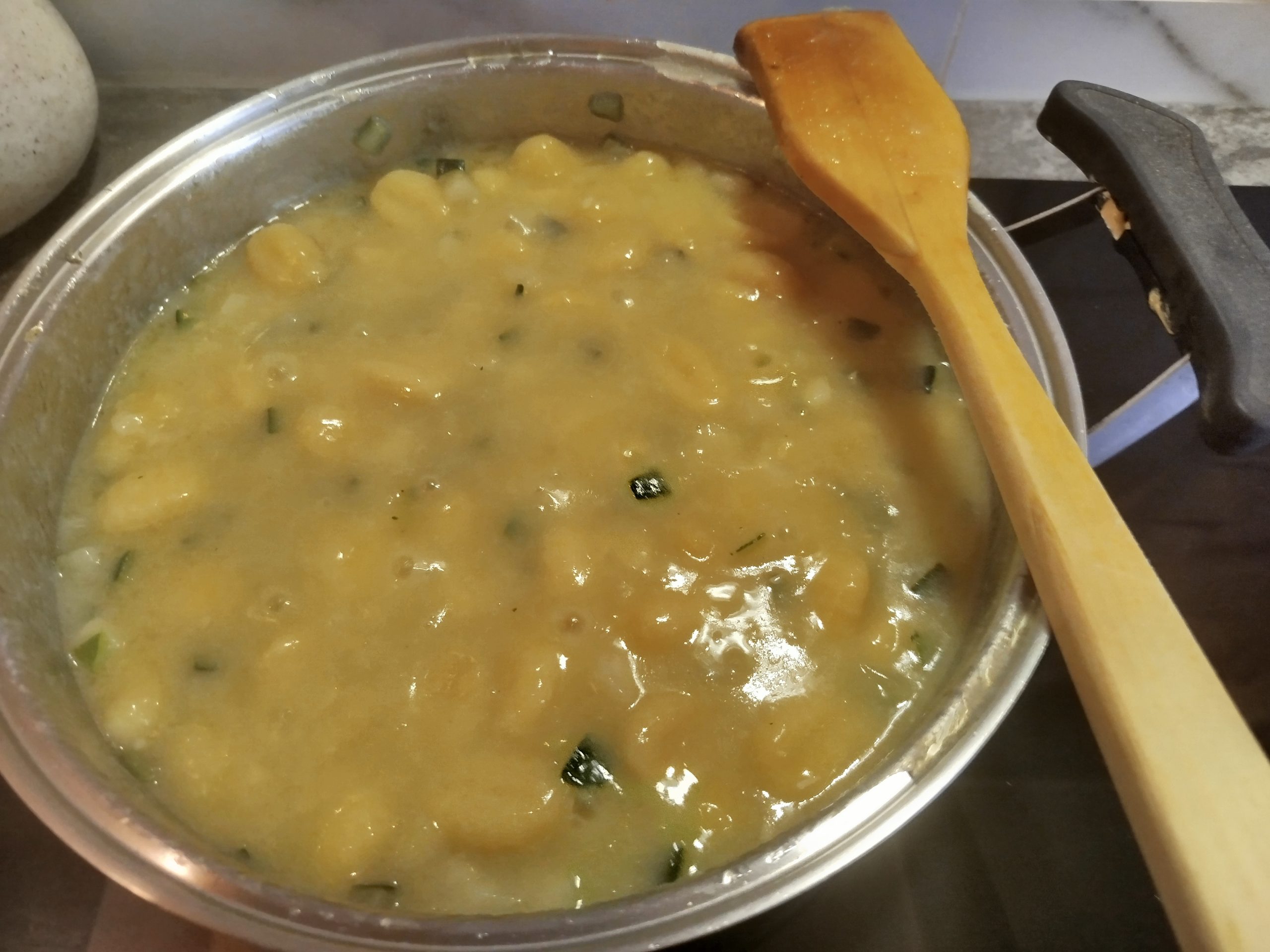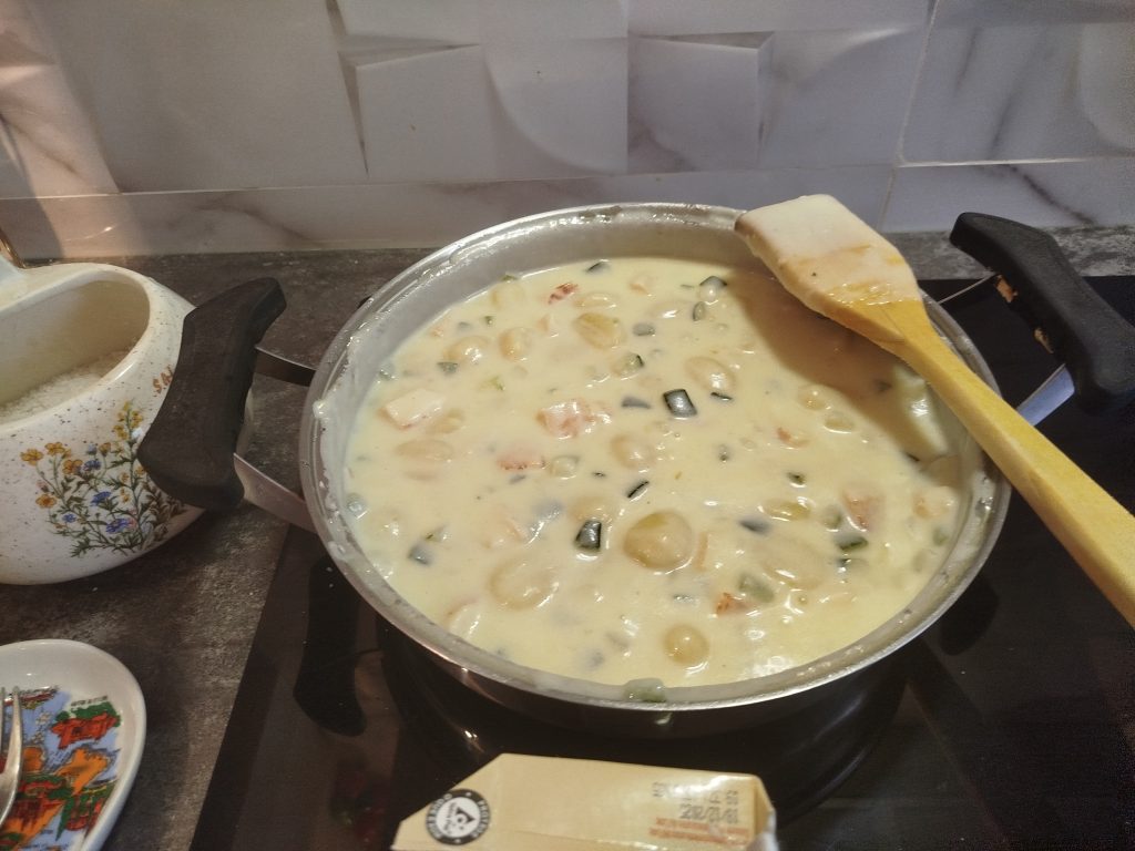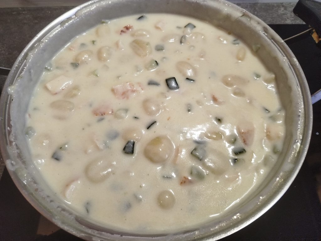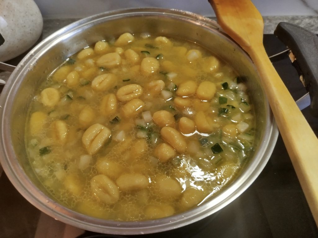 Echar dos vasos de agua, y los Ñoquis, mesclar todo muy bien, y dejar cocer a fuego lento, hasta que estén tiernos.