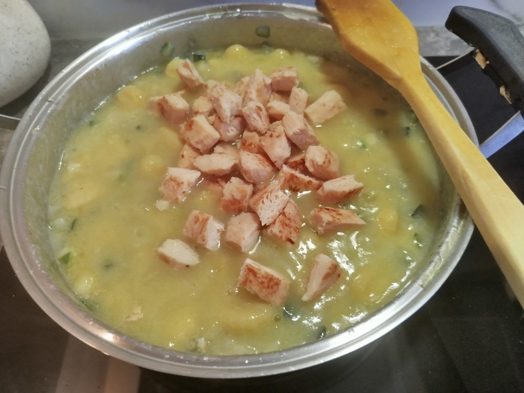 Añadir el pollo troceado y hecho, y la bechamel, mesclar todo muy bien, dejar cocer unos minutos y servir. Probar la salsa que este bien de sal.