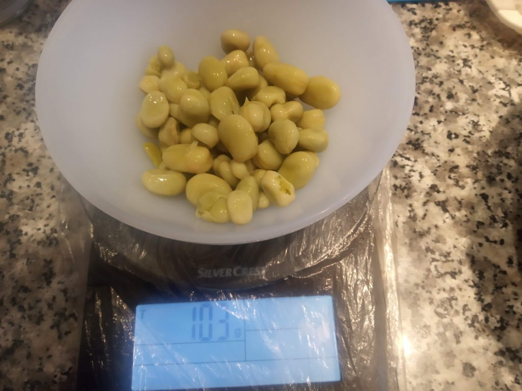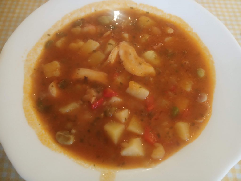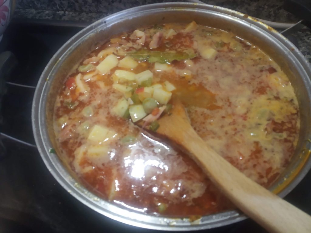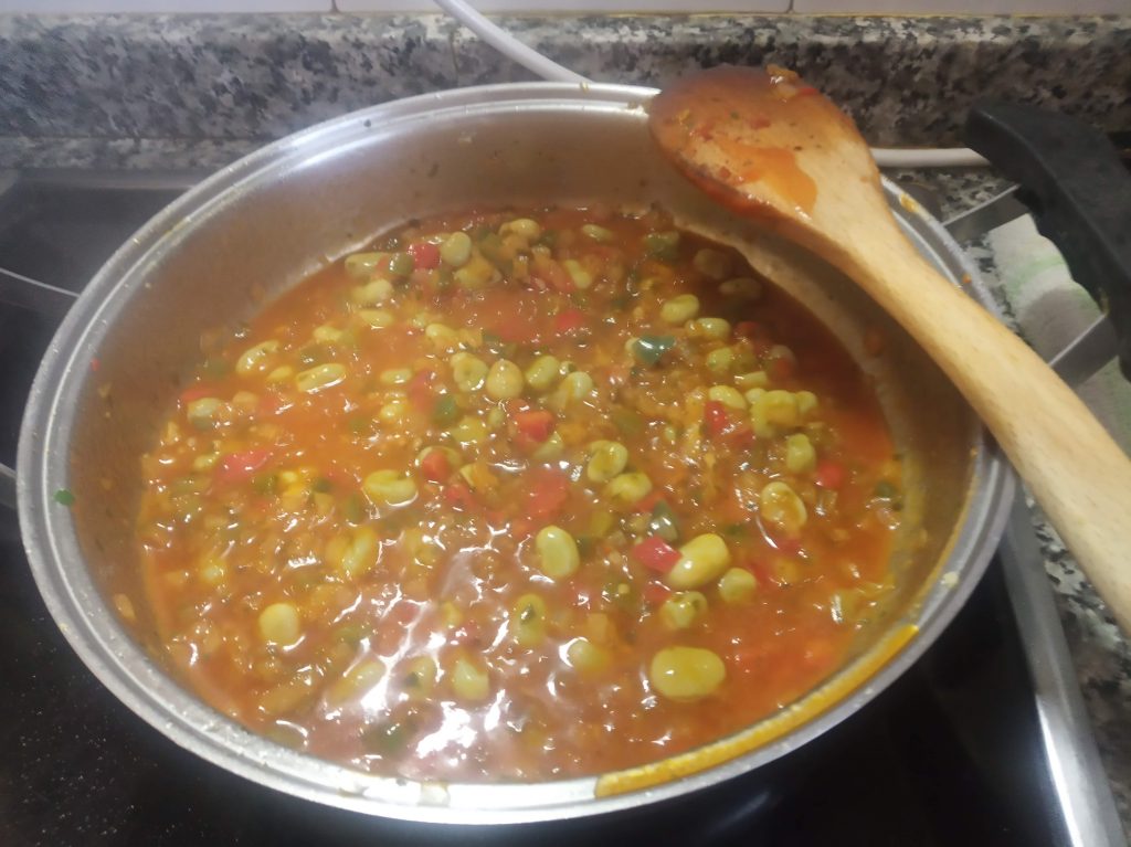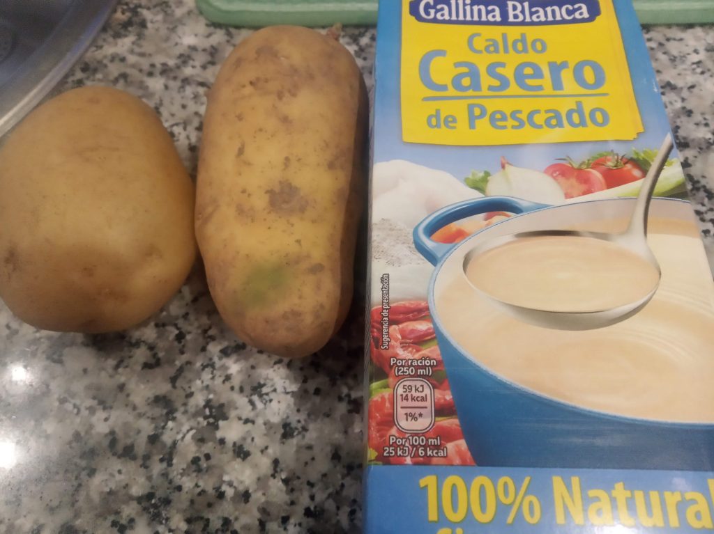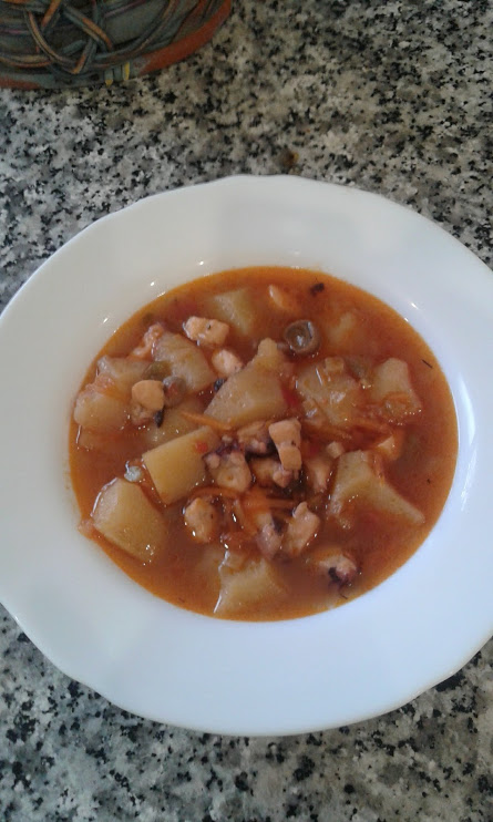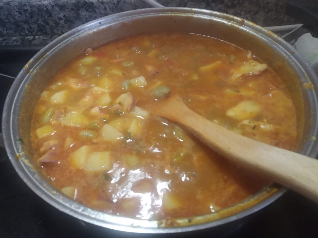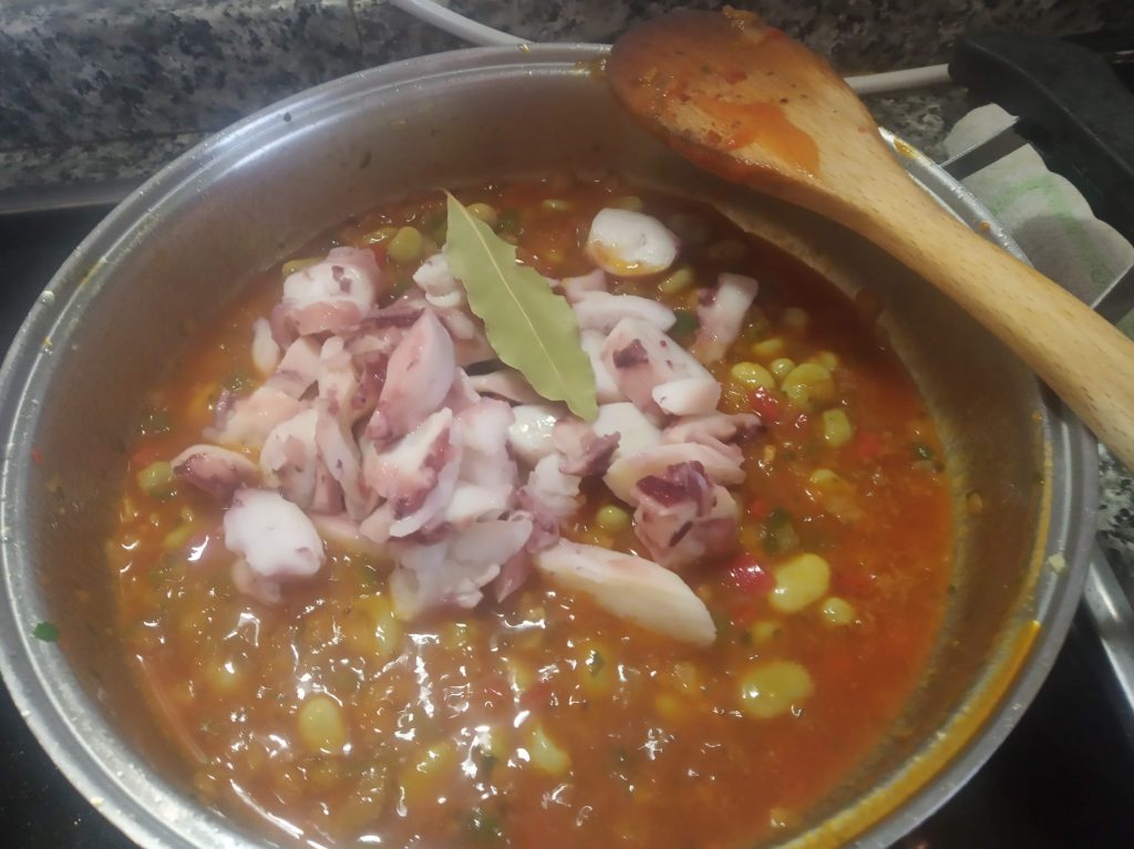 Echar las patatas cacheadas, la ñora, el laurel, el tomillo, las habitas, las rodajas de pulpo y el caldo de pescado, no echar todo, añadir si es necesario.