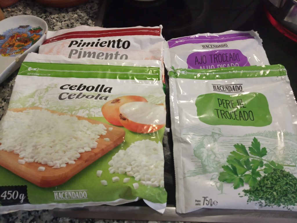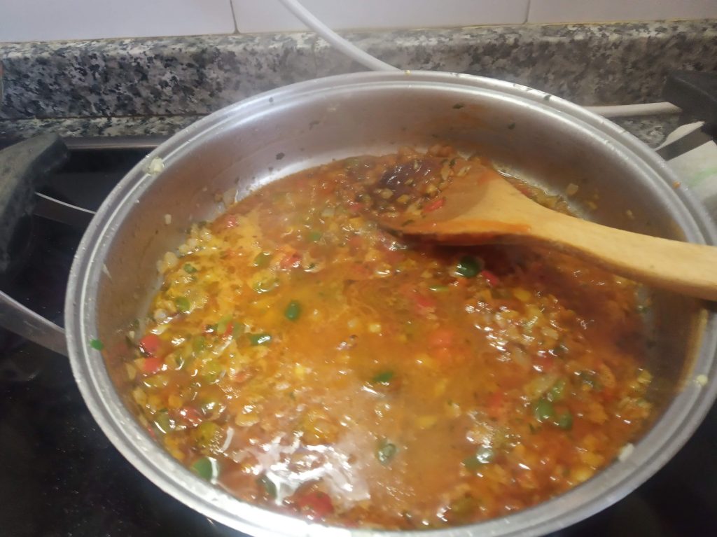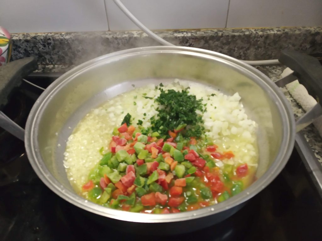Refreír en aceite de oliva, el ajo, la cebolla, la zanahoria y el pimiento troceado, con un poco de sal. (La verdura puede ser congelada)
