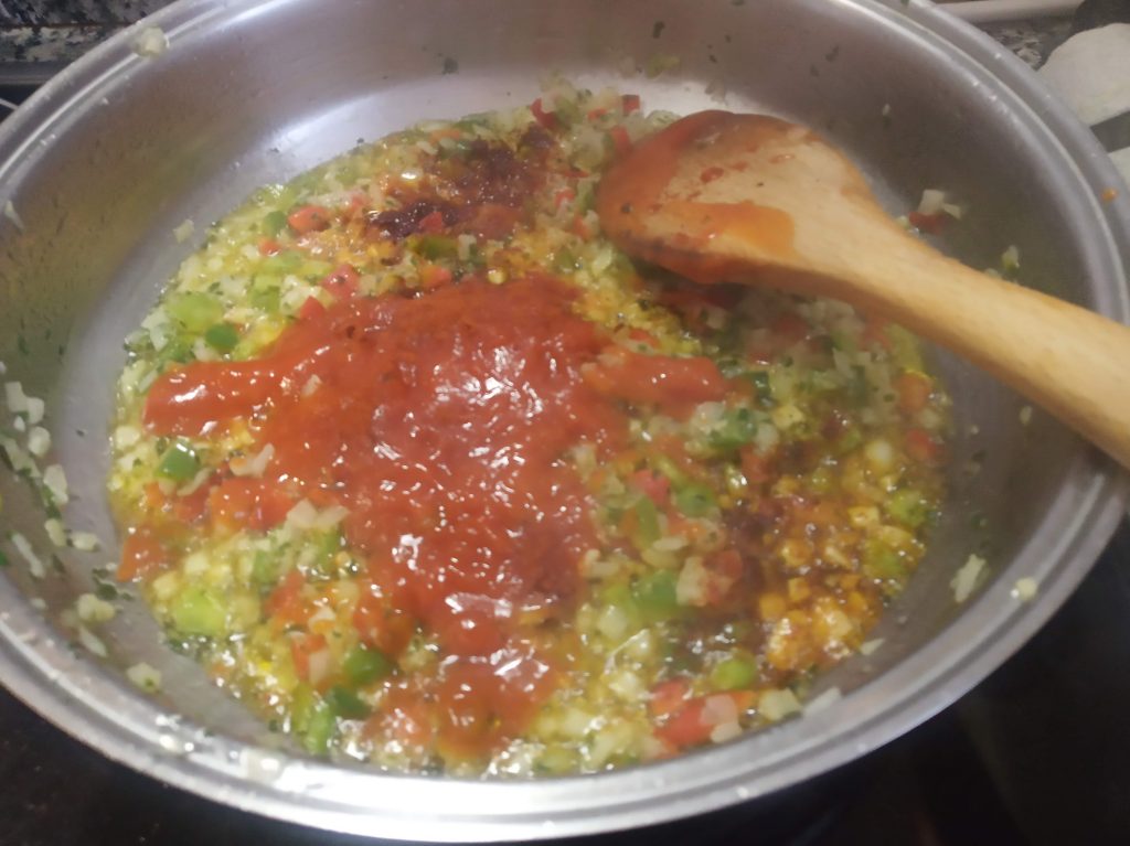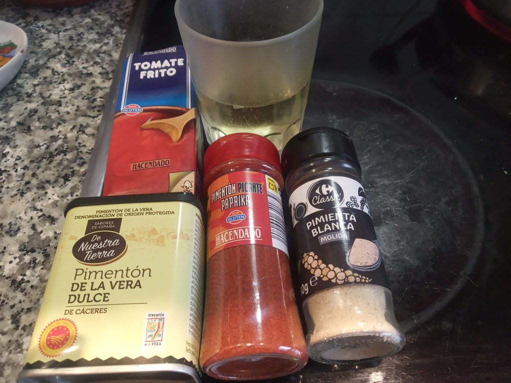 Agregar el tomate frito y el pimentón dulce y picante, dar unas vueltas.