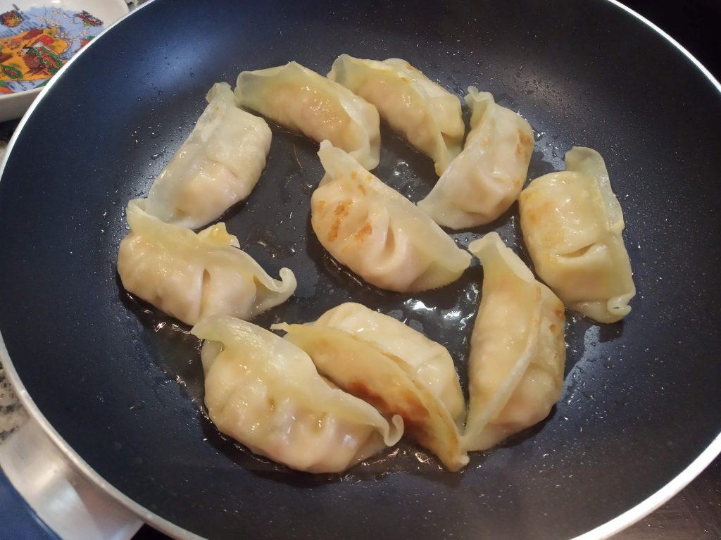 Poner una cucharada de aceite en la sarten, y cuando este caliente, poner las Gyozas congeladas, dorar un poco por cada lado, durante unos 2 minutos.