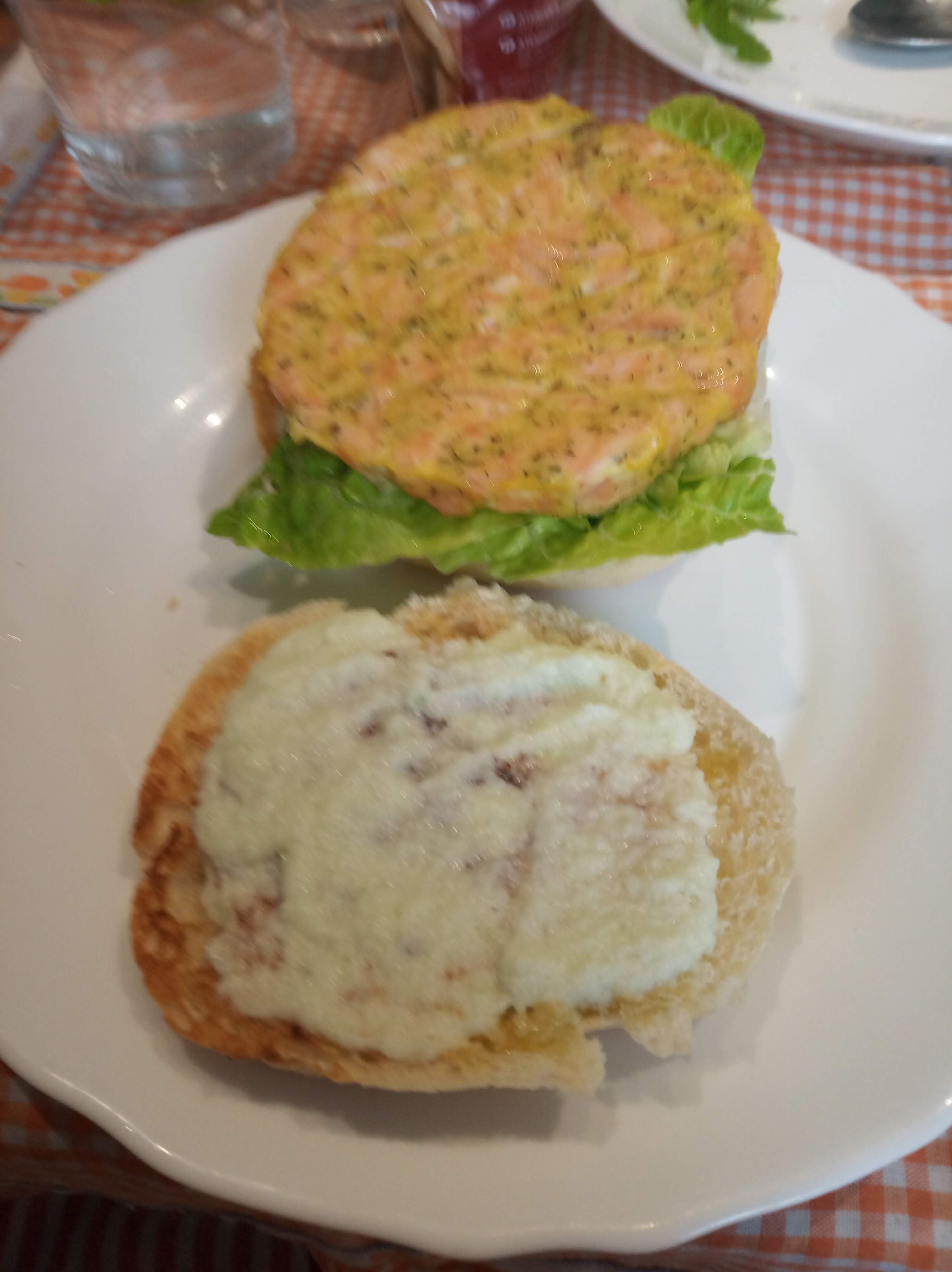 Corta el pan de hamburguesa, yo utilizo, unos redondos flojitos, que compro en el Mercadona para desayunar, no está procesado y harta menos. Tuestalo un poco por dentro y por fuera.