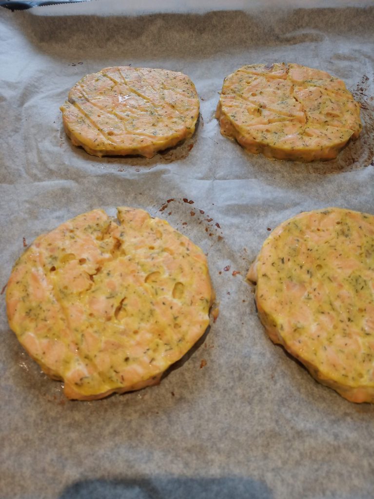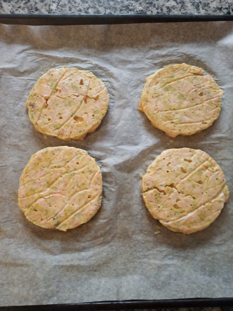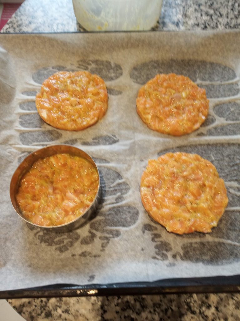 En la bandeja de horno, echamos un poquito de agua para que el papel de horno no se mueva. Si tienes un aro como el mío, divide la masa en cuatro partes, y vas rellenando el aro, aplastando bien la masa, retira el aro con cuidado, y así con todas. Si no tienes aros, con mucho cuidado te mojas las manos, te echas la masa intenta hacer una bola, más o menos, y luego la pones en la bandeja y aplastas con las manos.