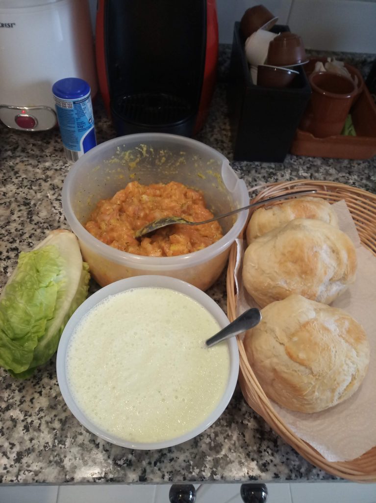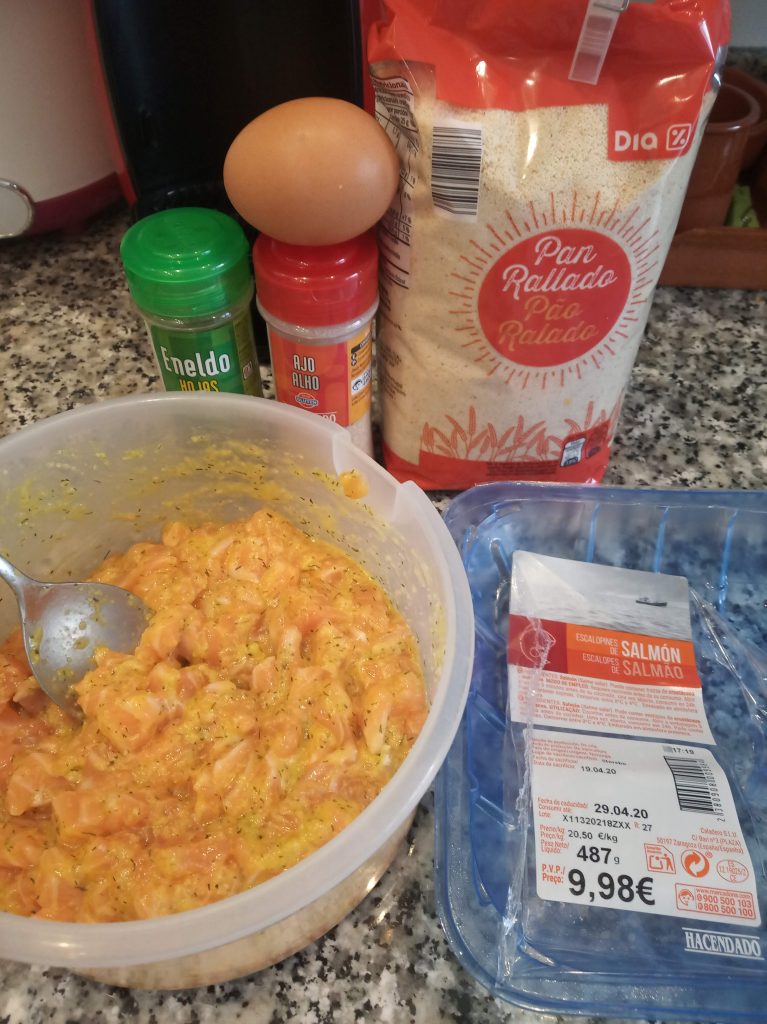 Lo echamos en un bol, y le añadimos 1 huevo, sal, mostaza, pan rallado, ajo molido, y eneldo. Lo mezcla todo muy bien, y dejar reposar mientras hacemos la crema de pepino.