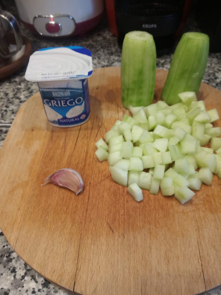 Pelamos los pepinos y cortamos por la mitad y luego en cuatro partes, yo les quito las pepitas con el cuchillo, eso ya al gusto de cada uno. Cortar en tiras y trocear, lo echamos en el vaso de la minipimer o batidora que tengas, un ajo, un poco de sal y el yogur, lo batimos muy bien. Presentar en un cuenco con una cuchara y que cada uno se sirva.